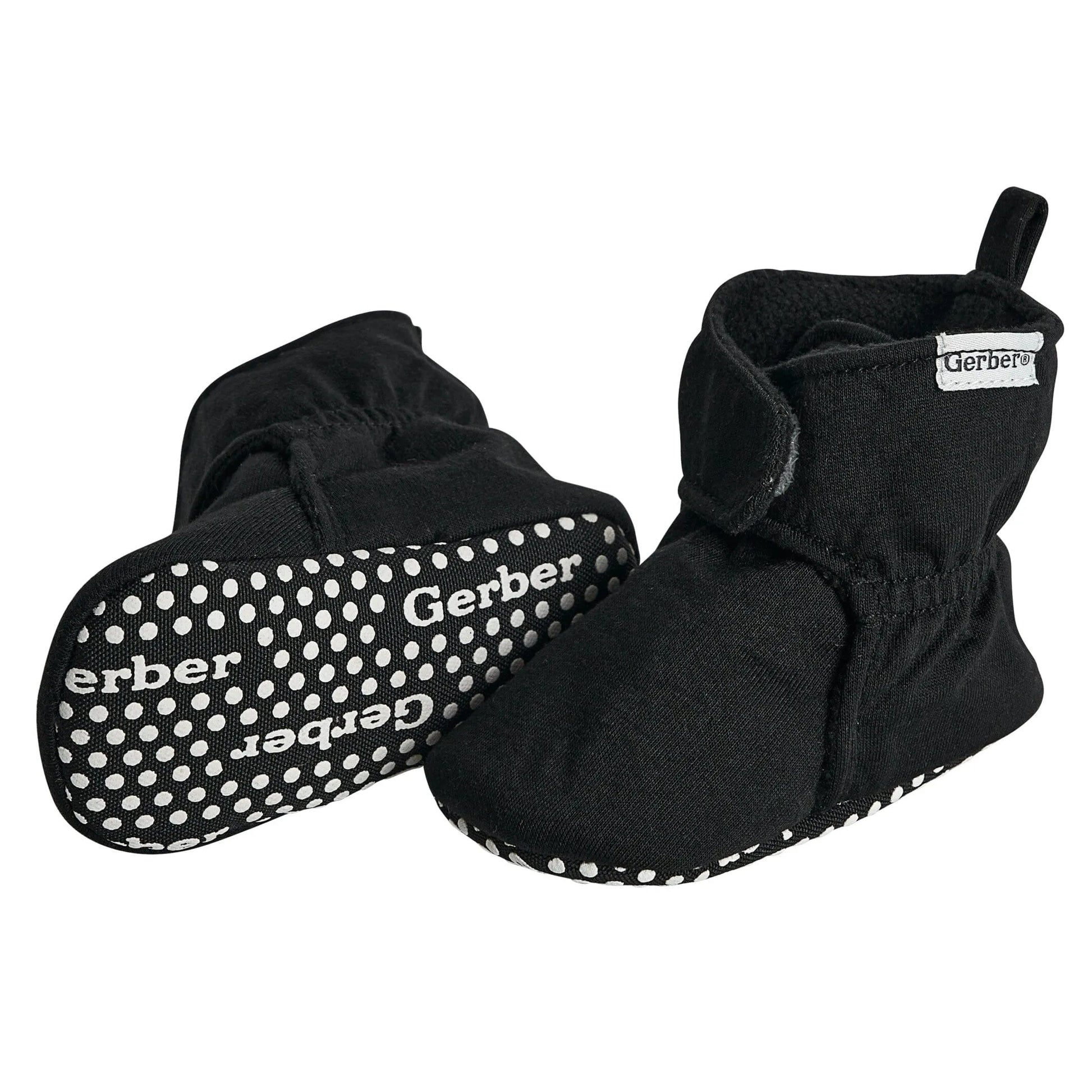 Your baby boy or baby girl will love these comfortable, black booties with poly-fleece lining designed to keep their little feet warm. Featuring a non-skid cotton canvas sole to provide extra balance support and secured with an extra-large hook and loop strap, these baby booties give a comfortably secure feel. A heel loop makes it easy to remove them when needed and minimizes wear and tear on the booties. Our essentials have been independently certified with STANDARD 100 by OEKO-TEX® so that you don’t have to worry about harmful substances in your baby’s wardrobe. This pack includes one pair of booties.
