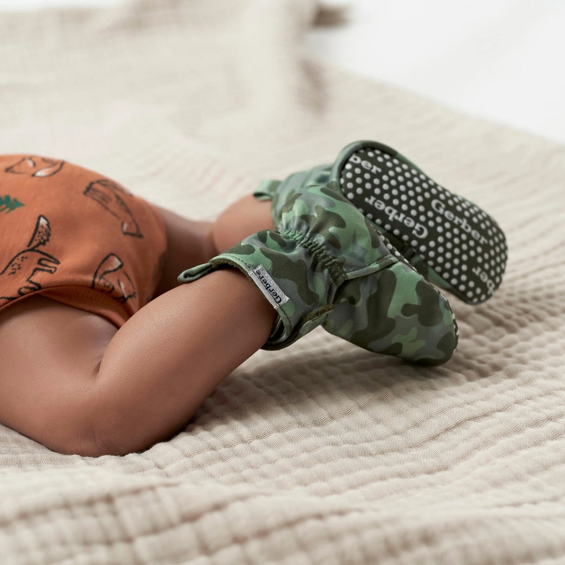 Your baby boy will love these comfortable, green camo booties with poly-fleece lining designed to keep his little feet warm. Featuring a non-skid cotton canvas sole to provide extra balance support and secured with an extra-large hook and loop strap, these baby booties give a comfortably secure feel. A heel loop makes it easy to remove them when needed and minimizes wear and tear on the booties. Our essentials have been independently certified with STANDARD 100 by OEKO-TEX® so that you don’t have to worry about harmful substances in your baby’s wardrobe. This pack includes one pair of booties.