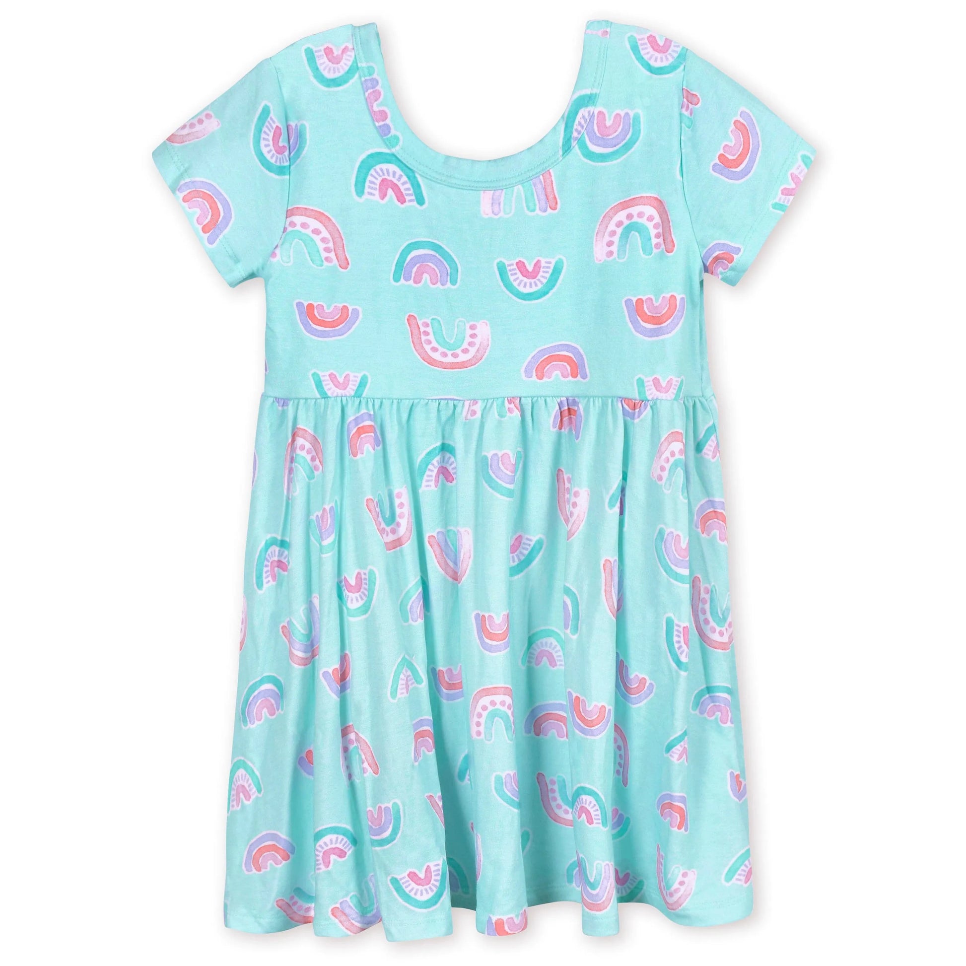 Designed for every season, our buttery soft collection of affordable rompers, sleepwear, Dresses and headbands will be their new wardrobe faves! We've partnered with Livaeco™ by Birla Cellulose to bring you and your little ones a more sustainably produced, environmentally-friendly viscose fiber collection made predominately from eucalyptus blended with spandex. This extremely soft rainbow print Dress is made for twirling. The perfect look for any occasion. High-quality, lightweight, breathable, durable fabric with the perfect amount of stretch for active babies and toddlers. Prints and solids made for sibling matching. This short sleeve twirl Dress is comfy fitting for all day wear. Gerber® quality, comfort, safety and value never goes out of style!