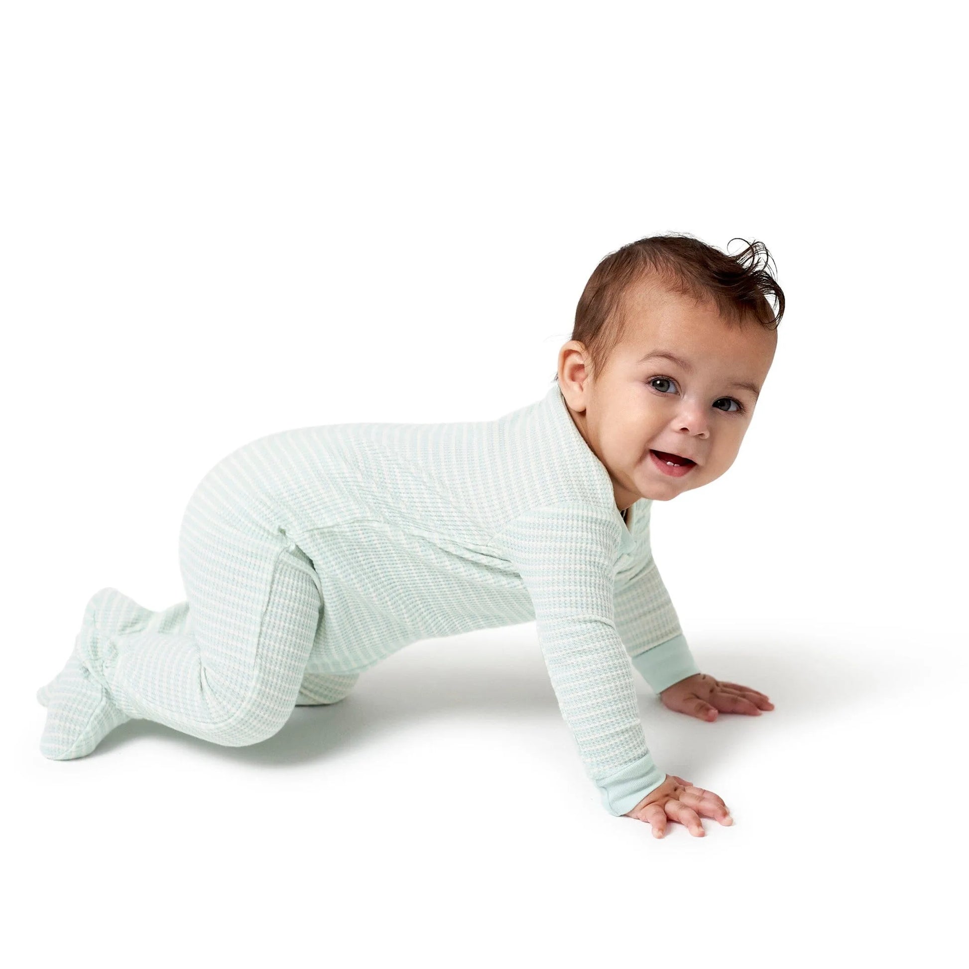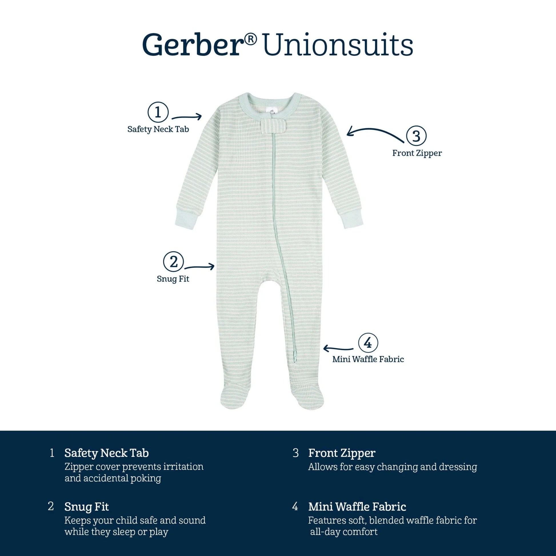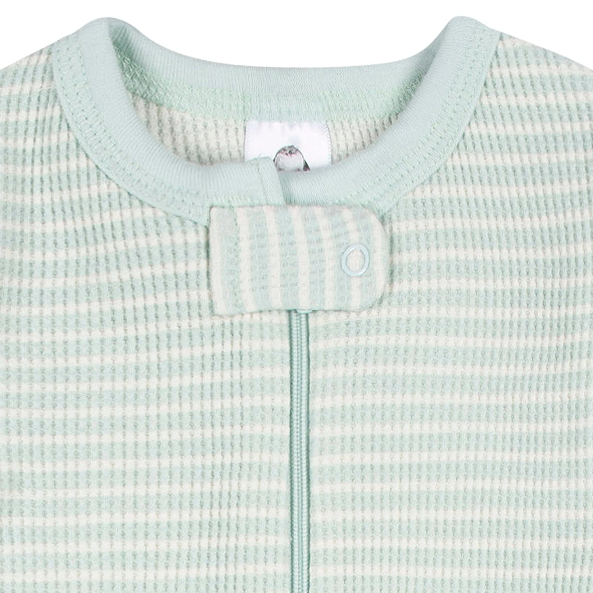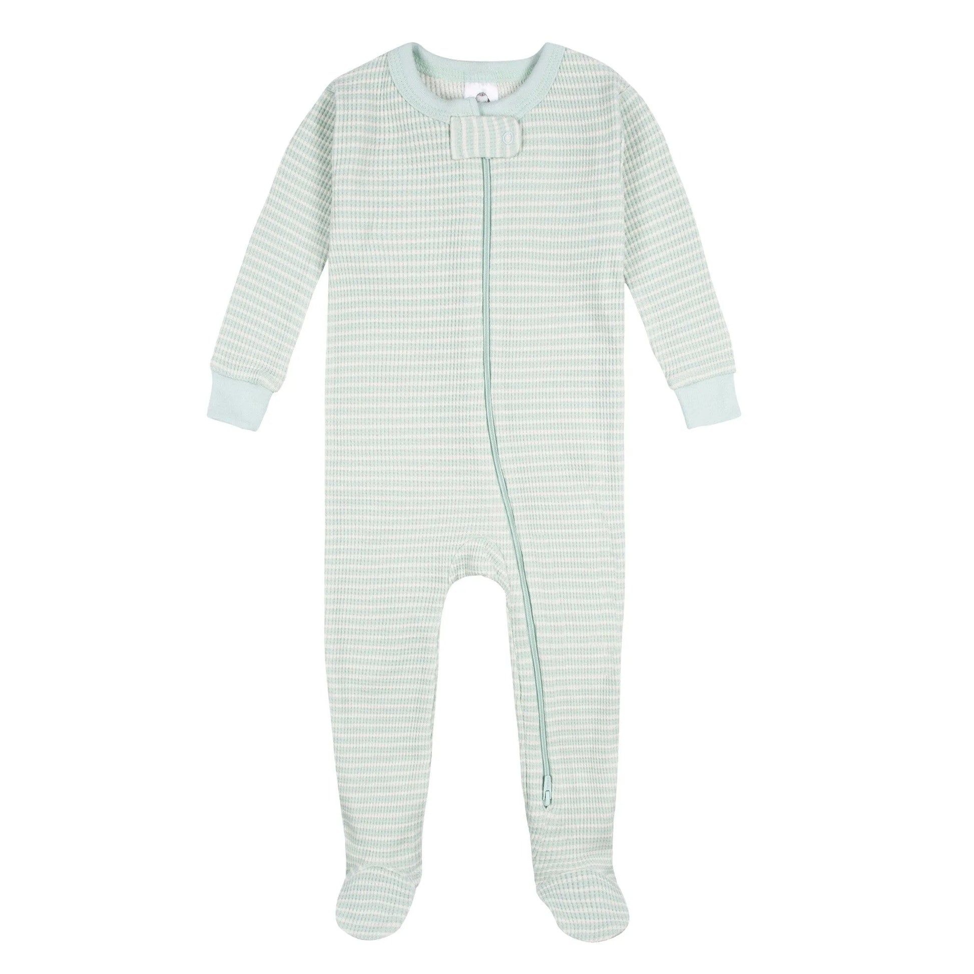Gerber® extremely soft cotton/polyester footed pajamas are perfect for 'round the clock wear. Designed for safety, our baby footed PJ’s feature a snug fit. High-quality, lightweight, breathable, durable fabric with the perfect amount of stretch for active babies. We had our essentials independently certified with STANDARD 100 by OEKO-TEX® so that you don’t have to worry about harmful substances in your baby’s wardrobe. Includes one light blue & ivory striped zipper front, footed pajama with long sleeves.