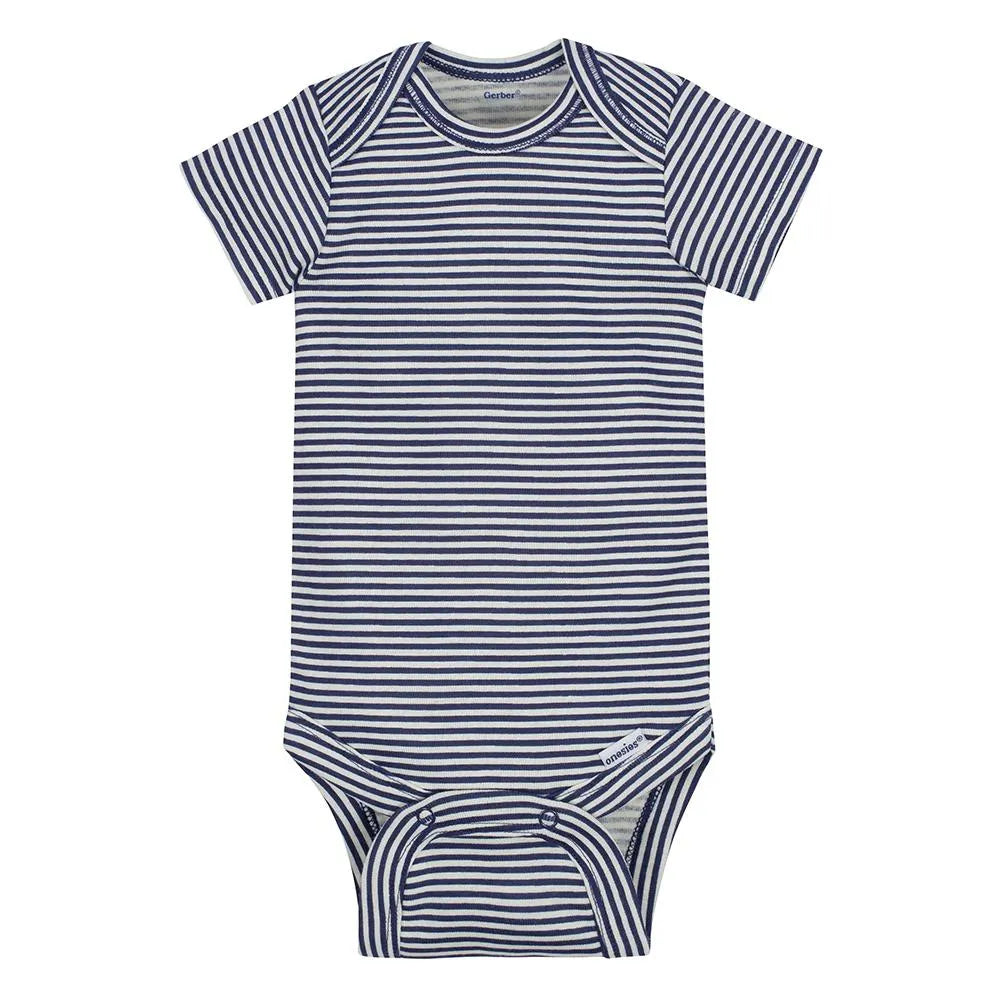 Give your little boy the gift of softness with this 5-pack of boys' Gerber Onesies® brand short sleeve bodysuits! The 100% cotton rib is breathable to keep him comfortable wherever his adventures take him. Each bodysuit has flocking and screen-print artwork that highlights a special theme that he'll enjoy looking at. These bodysuits give you options for creating new outfits! For a completely coordinated look, you can match these up with pants and socks in this collection featuring the same theme or mix and match them with a favorite set of shorts or pants you already have in the closet. Handy time-savers like a higher-in-the-front bottom snap closure cuts down on time spent changing diapers, while the lap shoulder neckline makes dressing easier for mom. The easy care fabric keeps laundry day light!