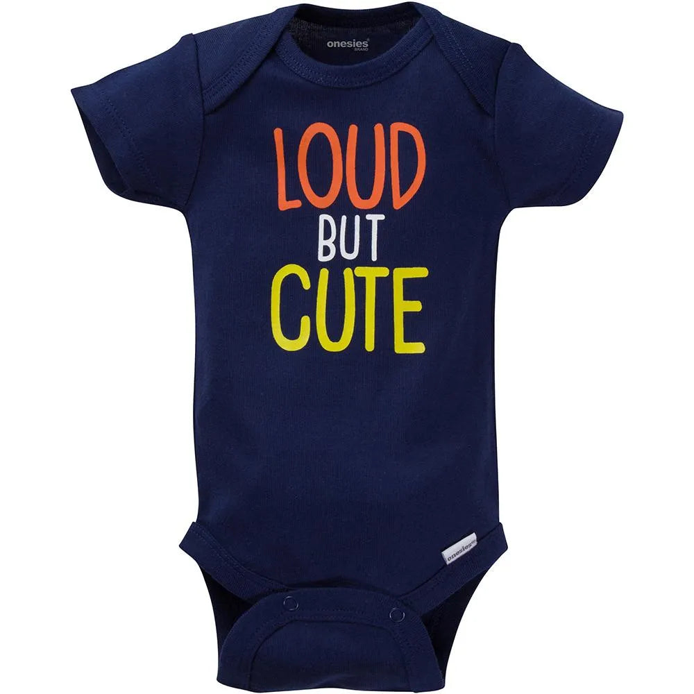 This 8-pack of baby boys' short sleeve Onesies brand bodysuits will have mom and baby smiling! Themed designs in screenprint and puff print create unique pieces that are lots of fun for little ones to wear. They pair perfectly with other wardrobe favorites, making dressing simple. 100% cotton rib provides a cool, breathable feel. The higher-in-the-front bottom snap closure makes diapering more streamlined. The bodysuits are easier to pull on with the expandable lap shoulder neckline. Machine wash and dry fabric ensures stress-free laundry days!