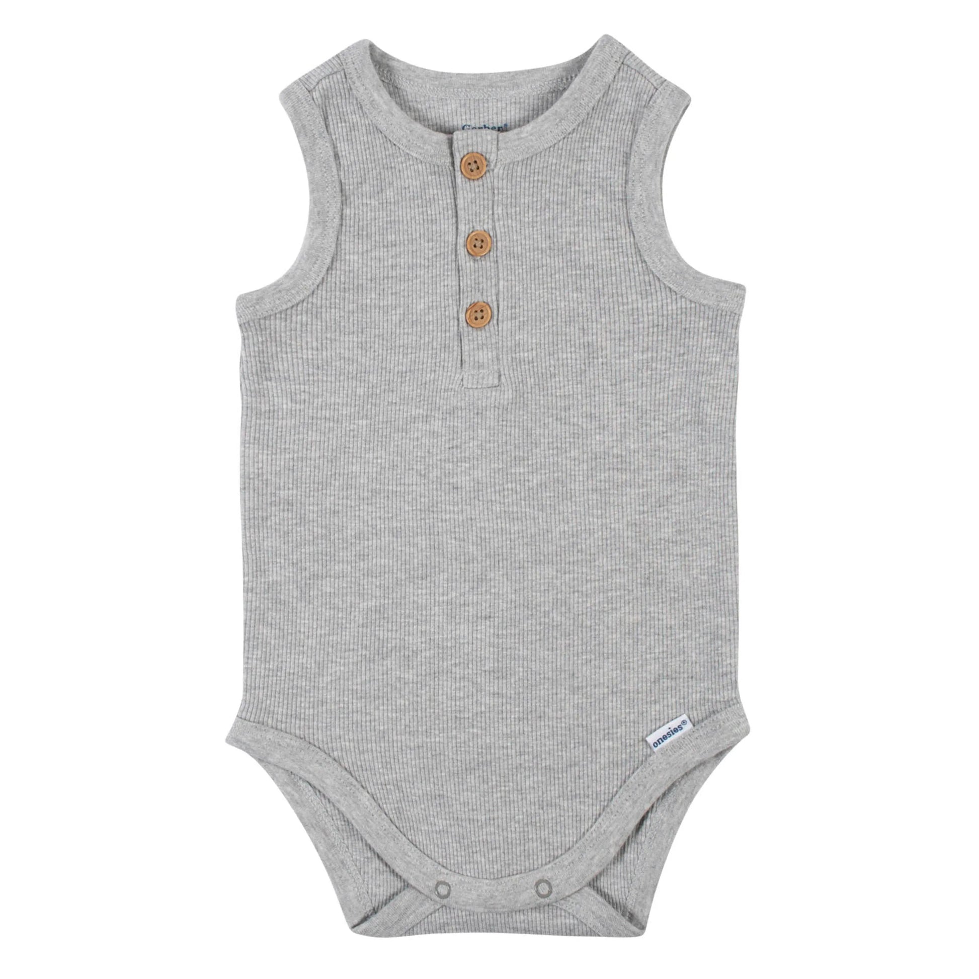 Modern Moments brings casual sophistication to your little one’s wardrobe. Each of our sleeveless Onesies(R) bodysuits are designed for easier changes and is made with super soft fabric for all-day comfort and easy care. We had our essentials independently certified with STANDARD 100 by OEKO-TEX® so that you don’t have to worry about harmful substances in your baby’s clothing. This pack includes one blue baby boy bodysuit and one gray bodysuit.