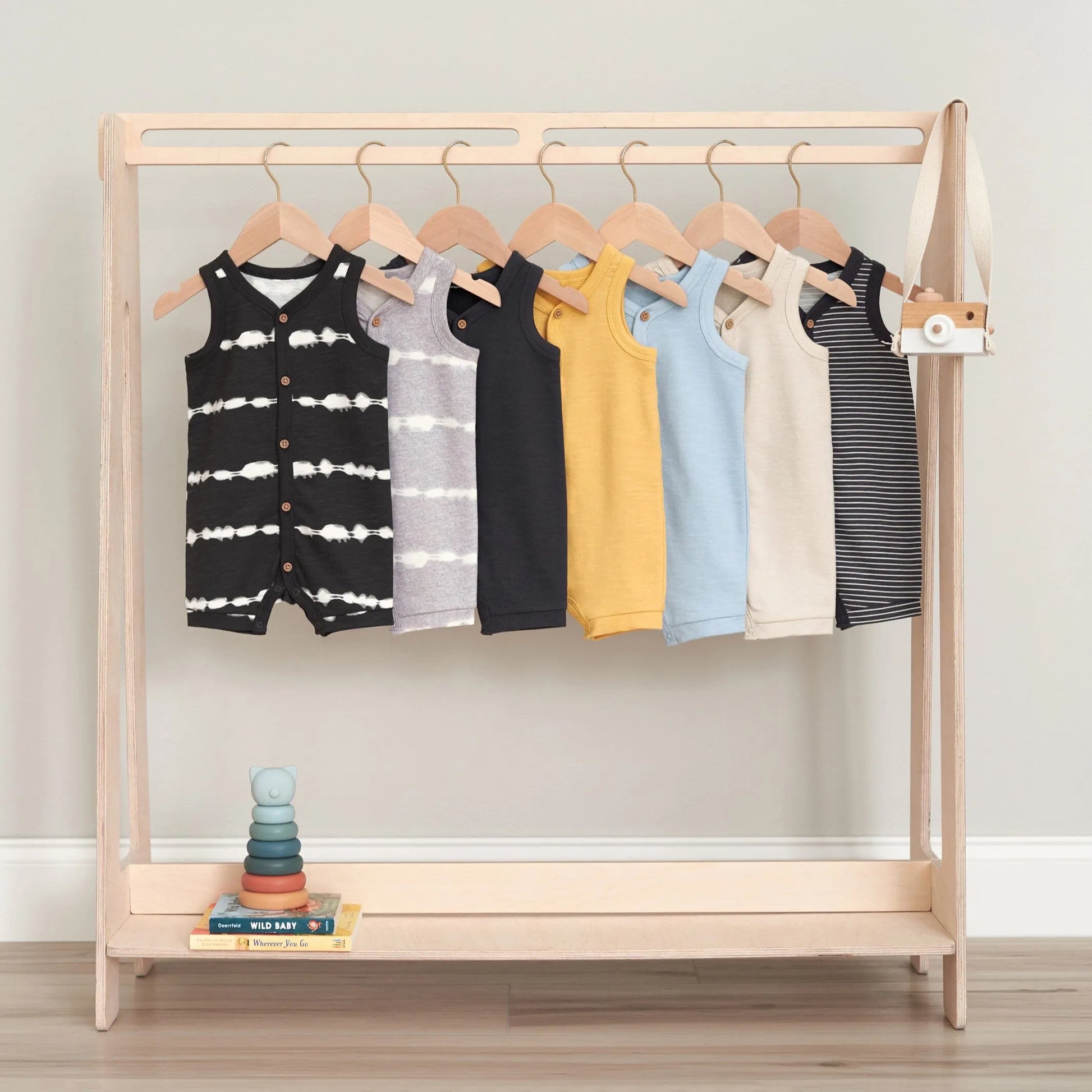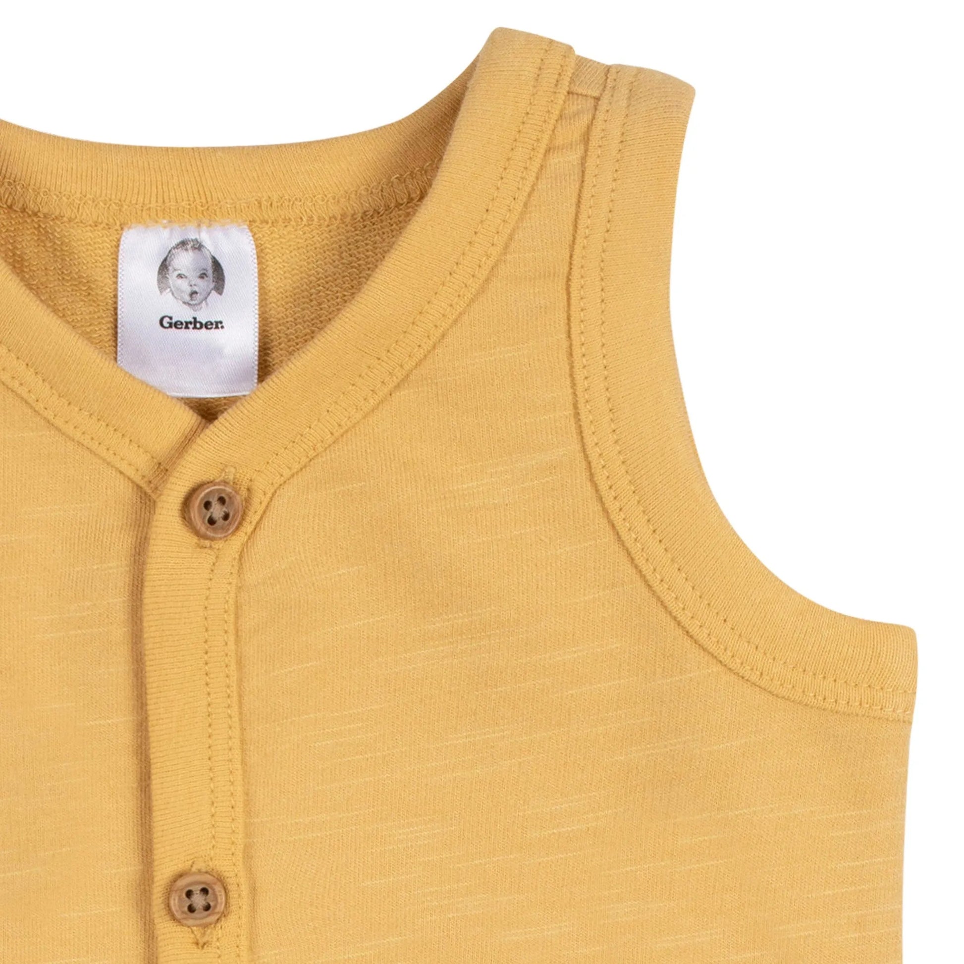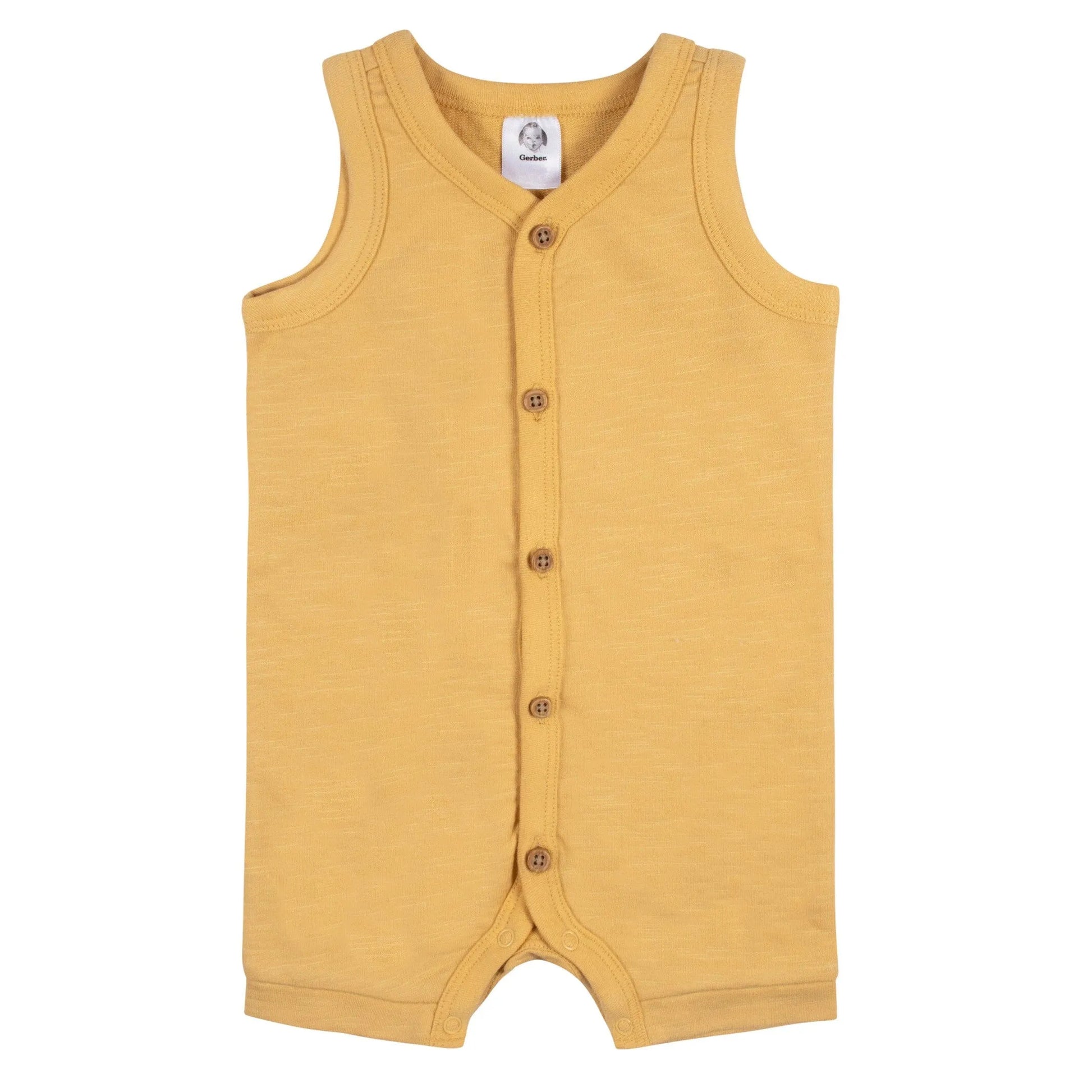 Gerber brings cute style to your little one’s wardrobe. Each of our sleeveless rompers is designed for easy on and off. They’re made with super soft cotton terry fabric for all-day comfort and easy care. We had our essentials independently certified with STANDARD 100 by OEKO-TEX so that you don’t have to worry about harmful substances in your baby’s clothing. Includes two baby boy grey and yellow sleeveless rompers.
