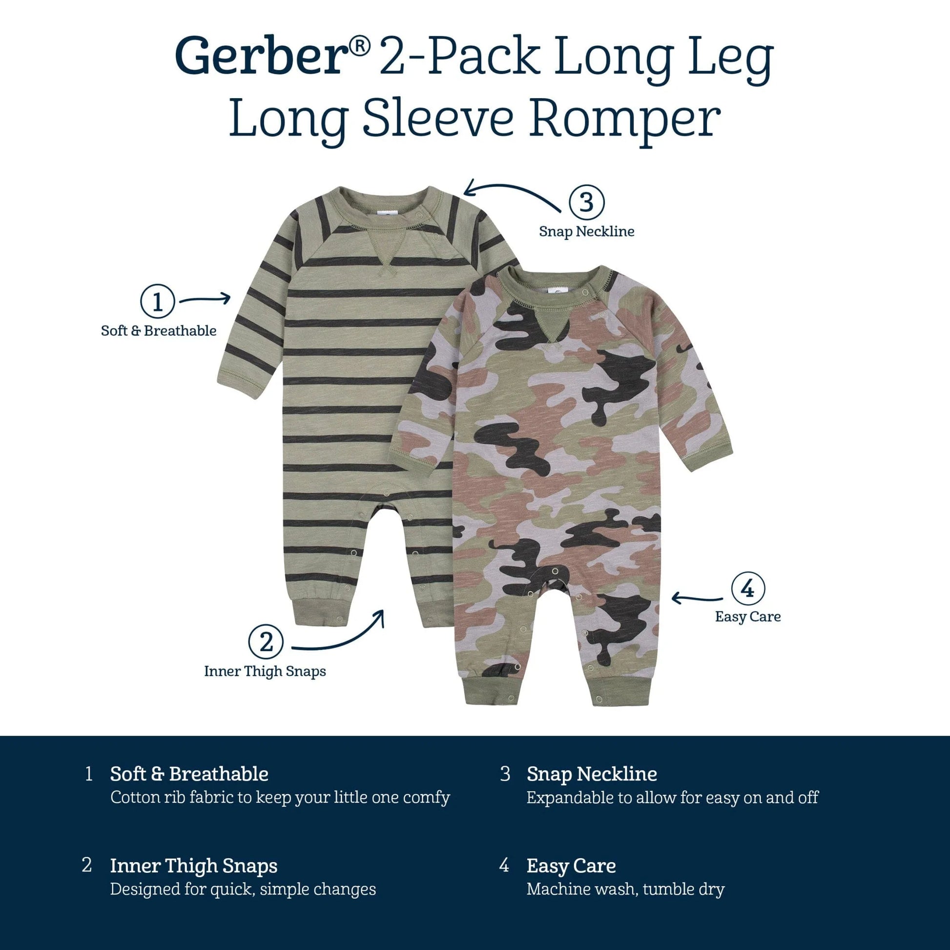 Your little one will adore our soft long sleeve rompers! Each one is made with 100% cotton french terry. We had our essentials independently certified with STANDARD 100 by OEKO-TEX® so that you don’t have to worry about harmful substances in your baby’s wardrobe. This pack includes two baby boy green camo and striped rompers.