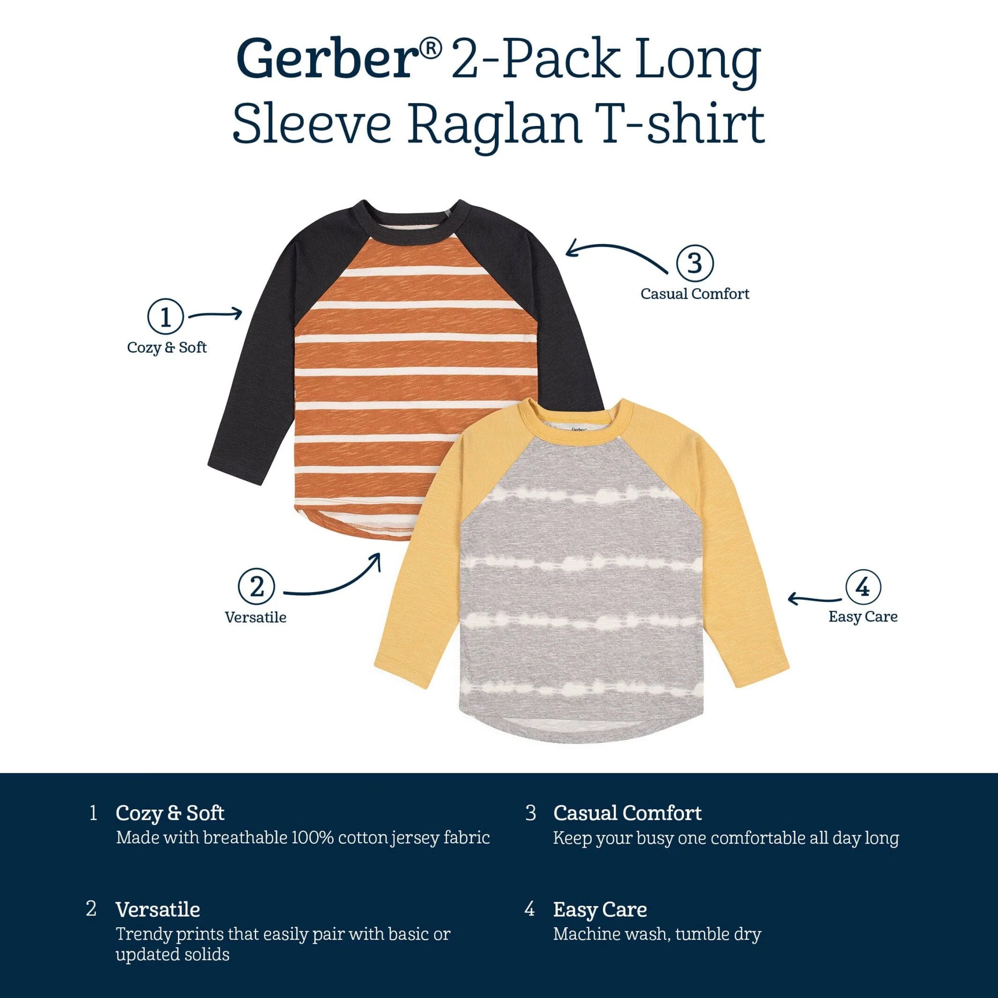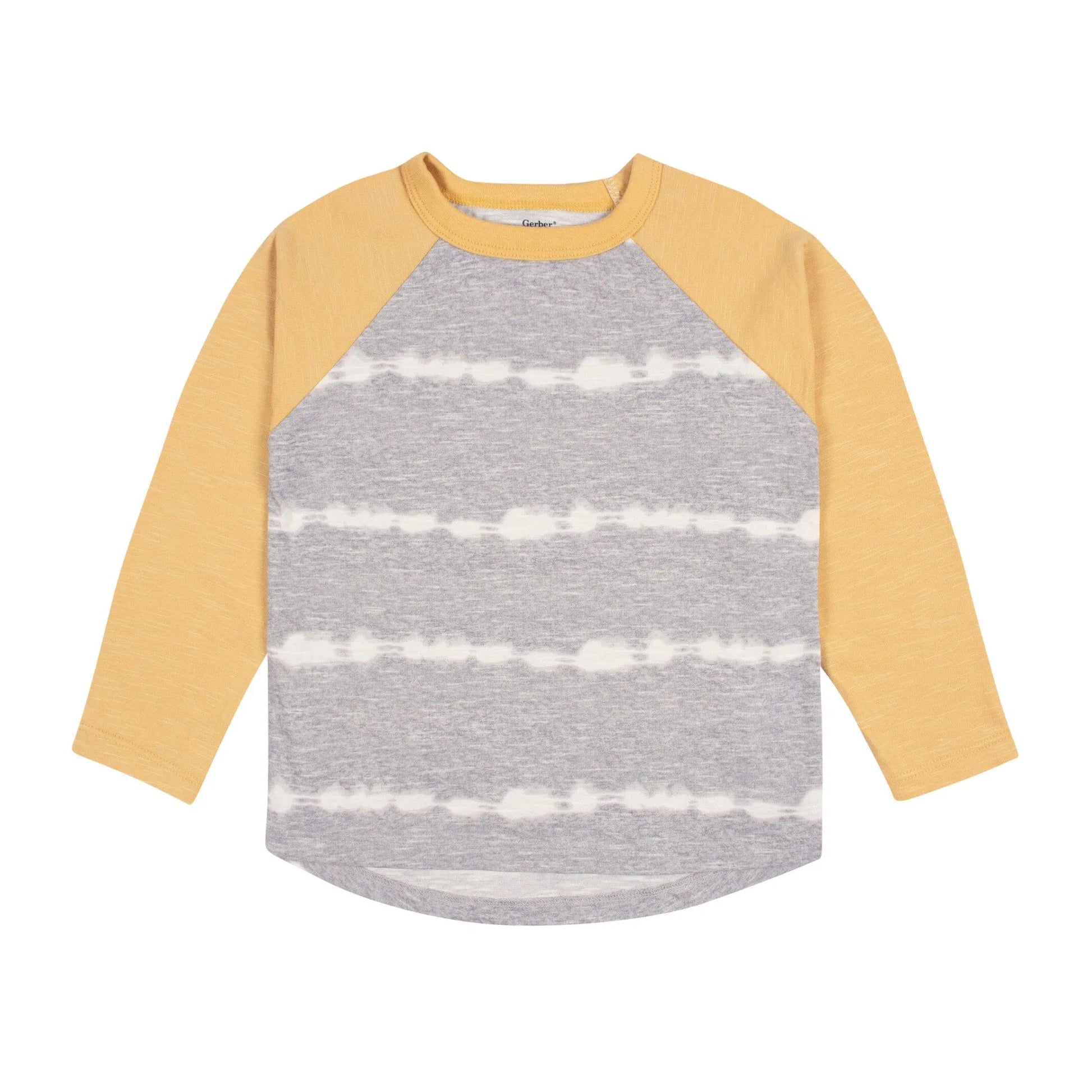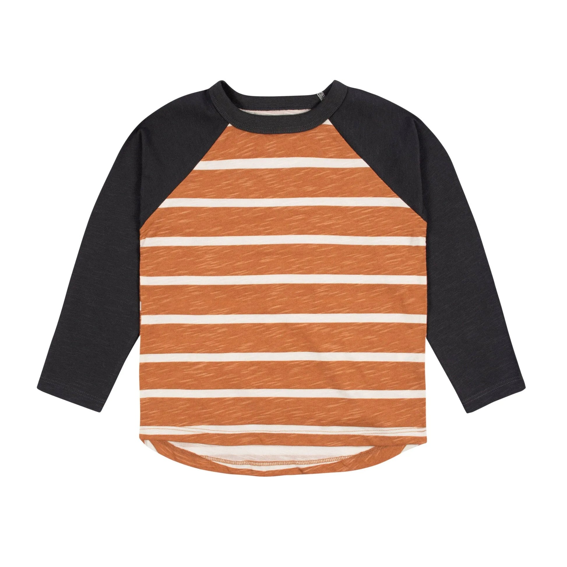 The extremely soft cotton jersey fabric of these raglan tees is perfect for all day wear. High-quality, lightweight, breathable, durable fabric for active infants and toddlers. We had our essentials independently certified with STANDARD 100 by OEKO-TEX® so that you don’t have to worry about harmful substances in your little one’s wardrobe. Includes two long sleeve rust stripe and tie dye printed raglan tees.