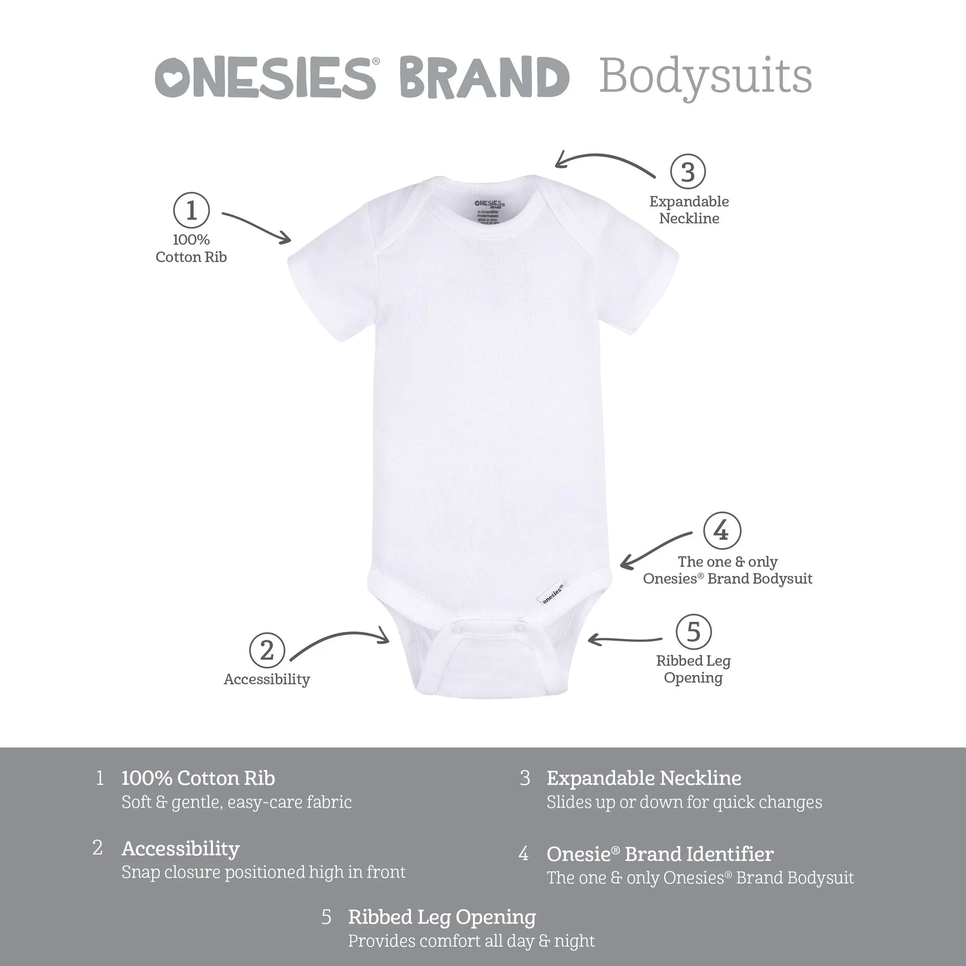 Rest easy knowing you're well-supplied with these baby essentials! This 2-pack of baby boy or girl unisex short sleeve Onesies® bodysuits is a versatile choice. The solid white color makes them perfect for pairing with any bottom. When used as a cozy underlayer, they'll keep your baby warm and comfortable in cooler weather. 100% cotton rib provides added breathability. A handy bottom snap closure simplifies diaper changing. An easily-expandable lap shoulder neckline makes them quick to pull on in the morning. Streamlined laundry days are guaranteed with the easy care, machine wash and dry fabric. We’re proud to announce that this product has been honored by the Mom’s Choice Awards as among the best in family friendly products! The Mom’s Choice Awards®️ (MCA) is globally recognized for establishing the benchmark of excellence in family-friendly media, products and services. A mark of distinction and trusted worldwide, the organization is based in the U.S. and has reviewed thousands of items from more than 60 countries.