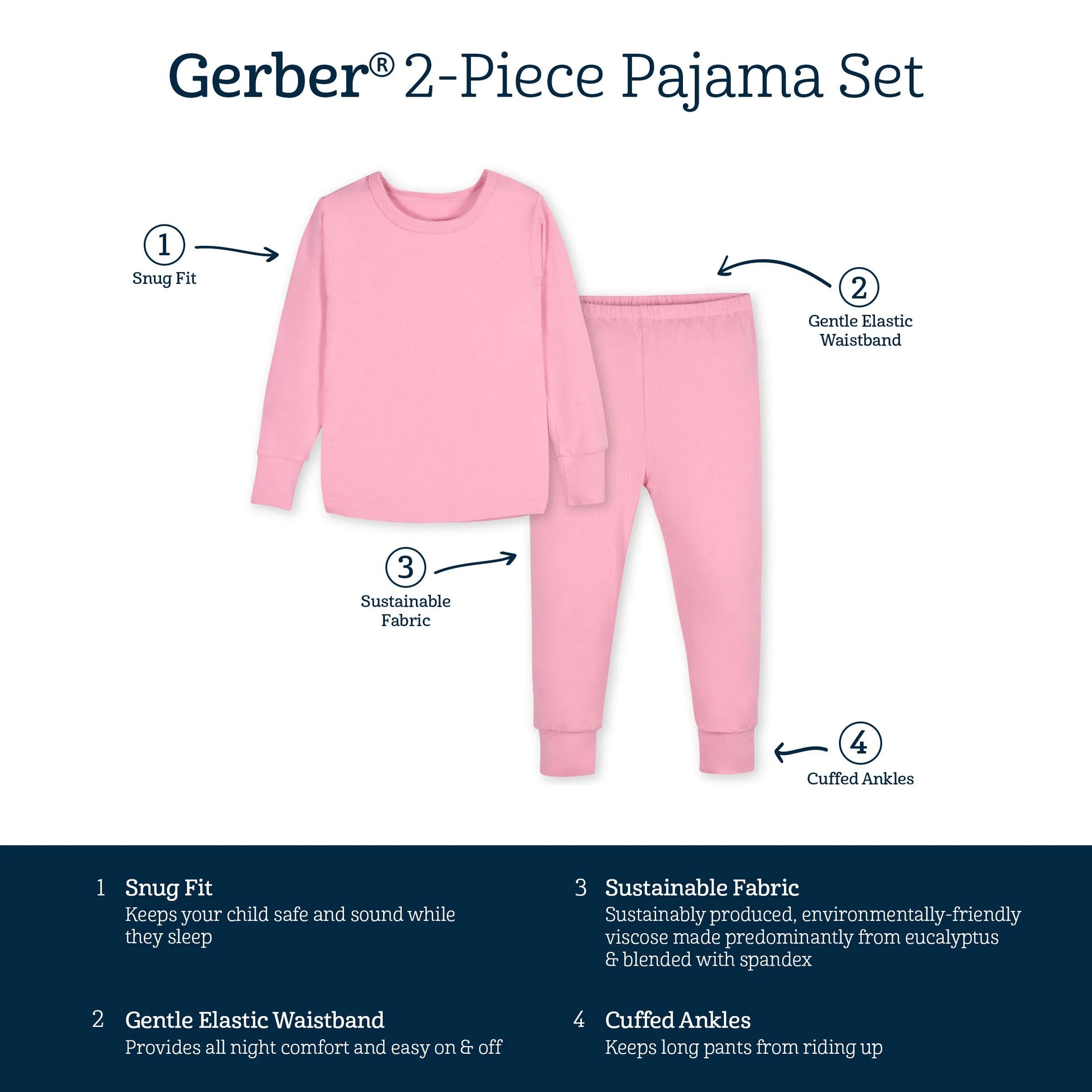 Designed for every season, our buttery soft collection of affordable rompers, sleepwear, Dresses and headbands will be their new wardrobe faves! We've partnered with Livaeco™ by Birla Cellulose to bring you and your little ones a more sustainably produced, environmentally-friendly viscose fiber collection made predominately from eucalyptus blended with spandex. This extremely soft 2-piece bubblegum pink pajama set is super comfy and a must have for bedtime for sure. High-quality, lightweight, breathable, durable fabric with the perfect amount of stretch for active babies and toddlers. Prints and solids made for sibling matching. Gerber® quality, comfort, safety and value never goes out of style!