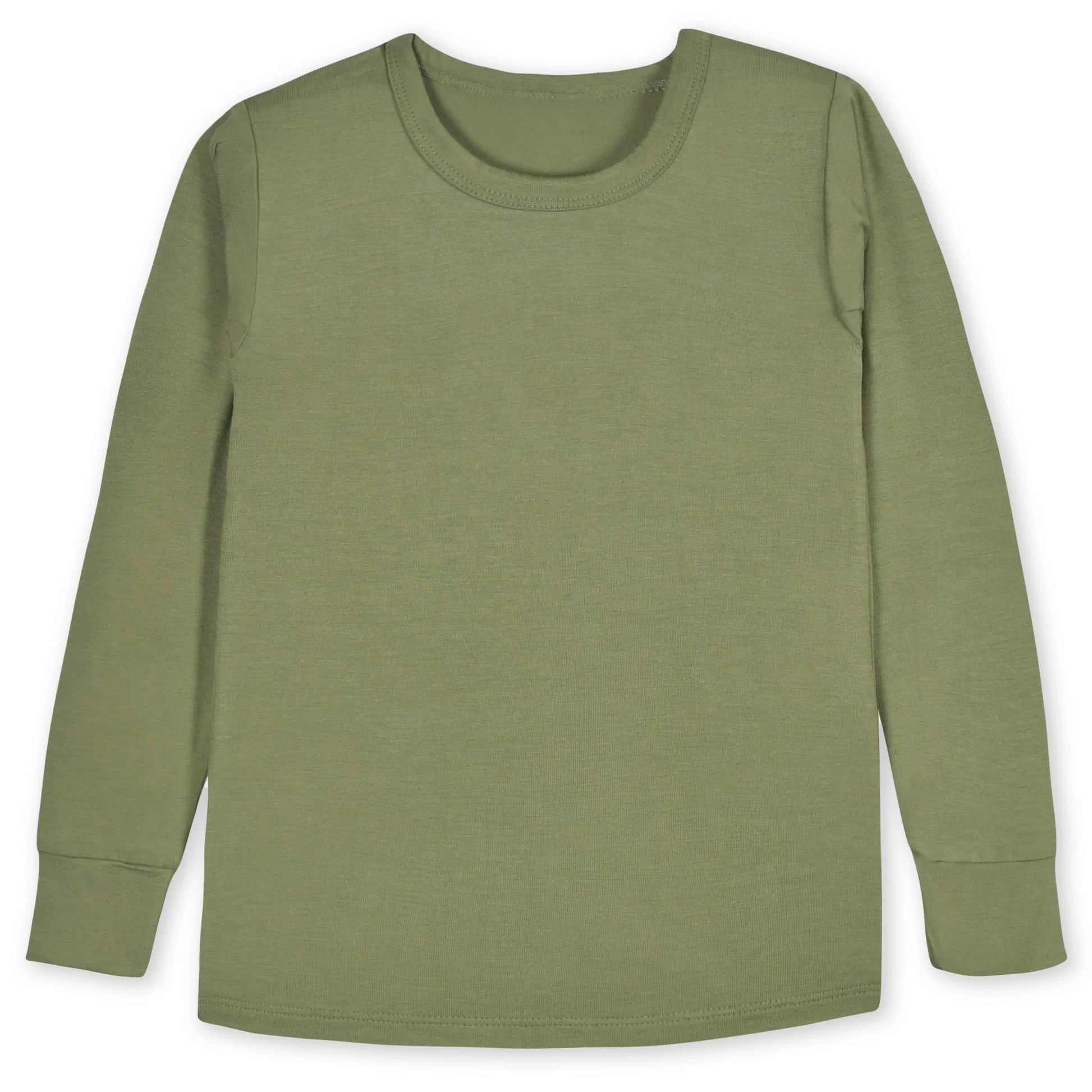 Designed for every season, our buttery soft collection of affordable rompers, sleepwear, Dresses and headbands will be their new wardrobe faves! We've partnered with Livaeco™ by Birla Cellulose to bring you and your little ones a more sustainably produced, environmentally-friendly viscose fiber collection made predominately from eucalyptus blended with spandex. This extremely soft 2-piece solid mos / olive green pajama set is super comfy and a must have for bedtime for sure. High-quality, lightweight, breathable, durable fabric with the perfect amount of stretch for active babies and toddlers. Prints and solids made for sibling matching. Gerber® quality, comfort, safety and value never goes out of style!