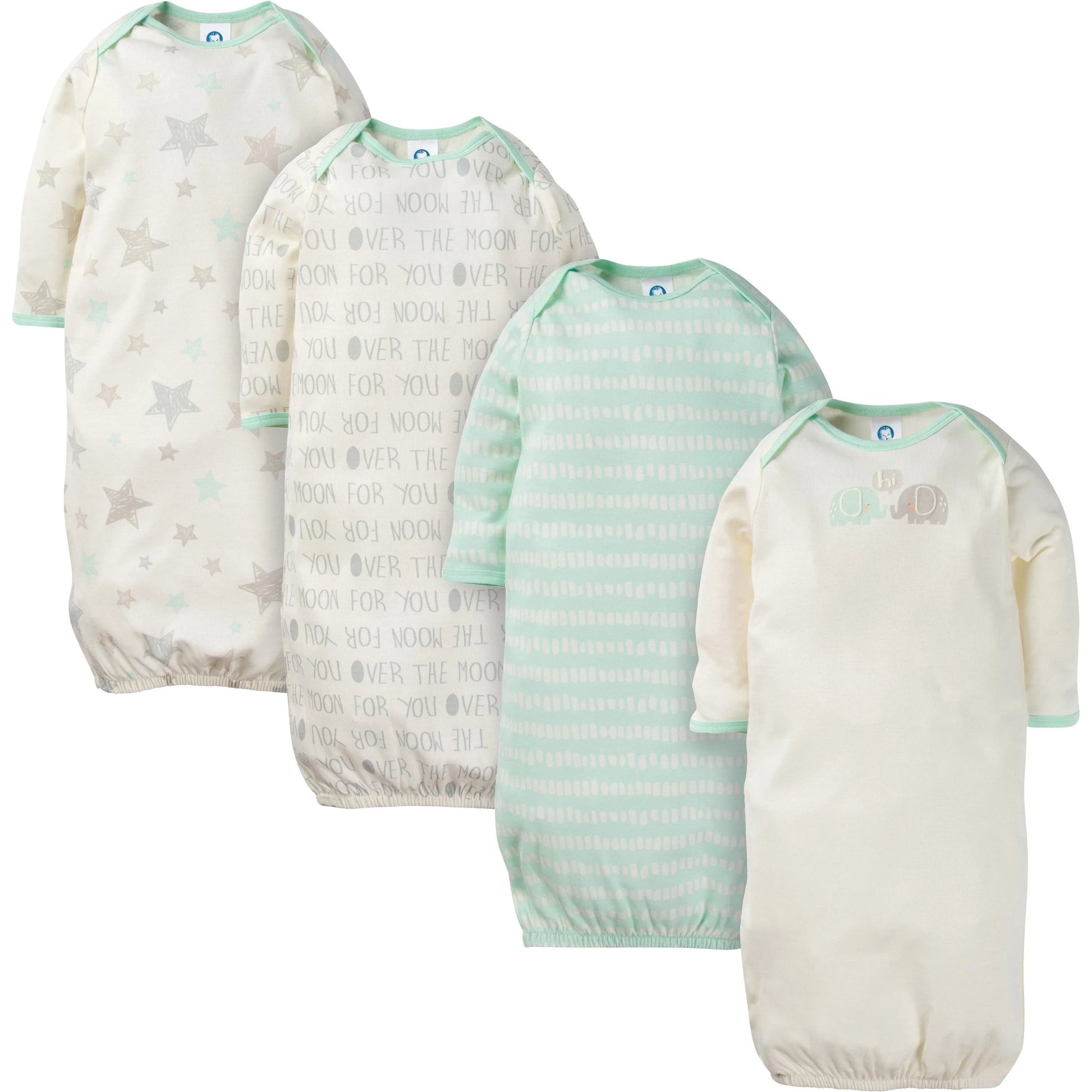 Fun days start with sweet dreams the night before! This 4-pack of baby boy or girl unisex lap shoulder gowns from Gerber makes an ideal choice for sounder sleeping. The 100% cotton rib fabric soothes your little one while drifting off. It's breathable and cool for added comfort. Puff and screenprint accents make the gowns more enjoyable for little ones to wear. The open bottom design ensures late night diaper changes won't keep mom or baby awake for long. Cleaning is easier with the machine wash and dry fabric.