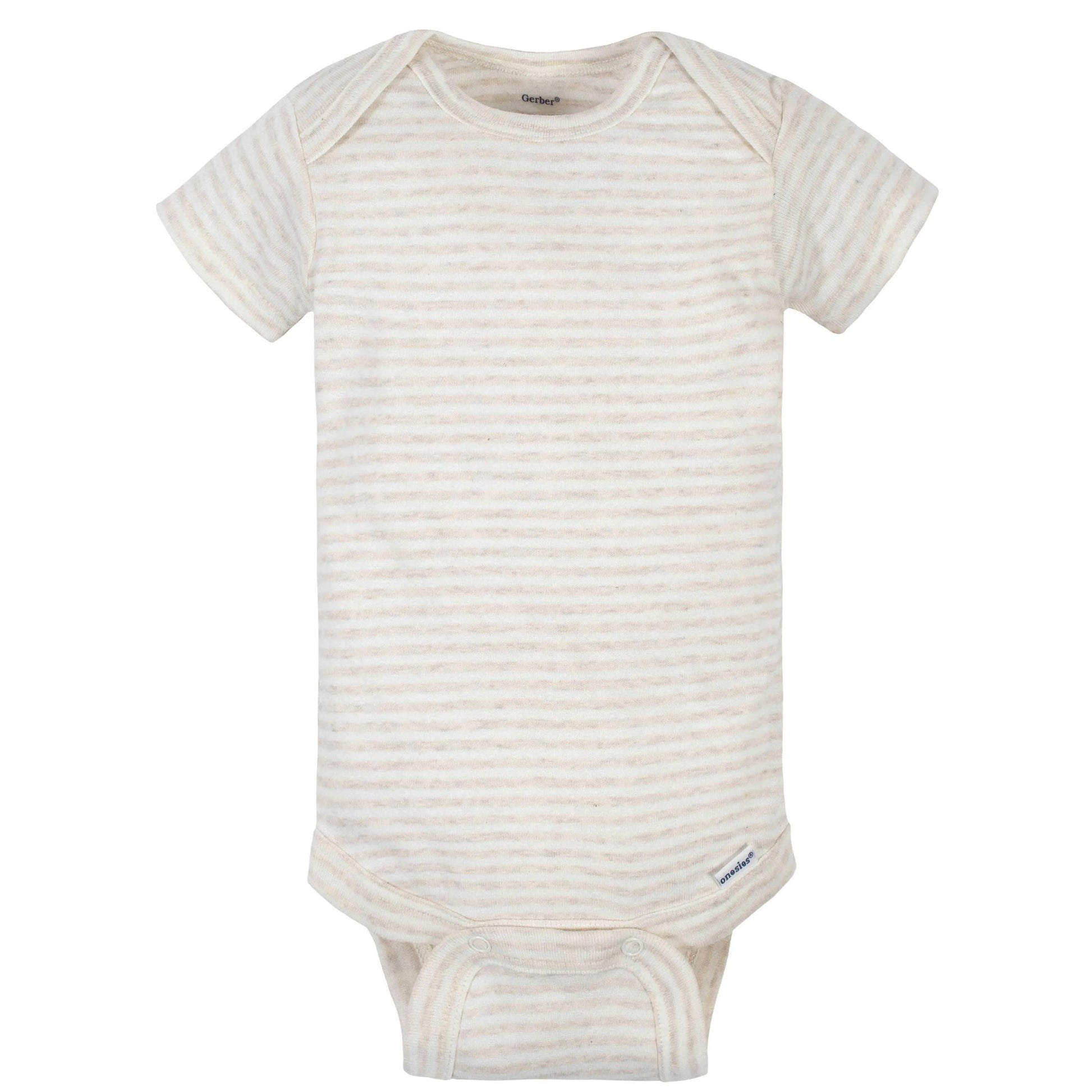 Baby Onesies® bodysuits are essential for baby! These adorable, assorted Onesies® bodysuits are made with a soft cotton fabric that’s perfectly comfortable against baby’s delicate skin. Baby will love how breathable this material is! We had this product independently certified with STANDARD 100 by OEKO-TEX® so that you don’t have to worry about harmful substances in your baby’s clothing. This pack includes four bodysuits. These classic baby clothes feature lap shoulder necklines that make wardrobe changes easier than ever. The necklines allow the garment to slip over baby’s head in total comfort. They also feature bottom snap enclosures that are conveniently positioned higher in front to quicken diaper changes. Gerber® Onesies® bodysuits are machine washable and machine dryable. Gerber® offers quality products that parents trust to bring their babies style and comfort.
