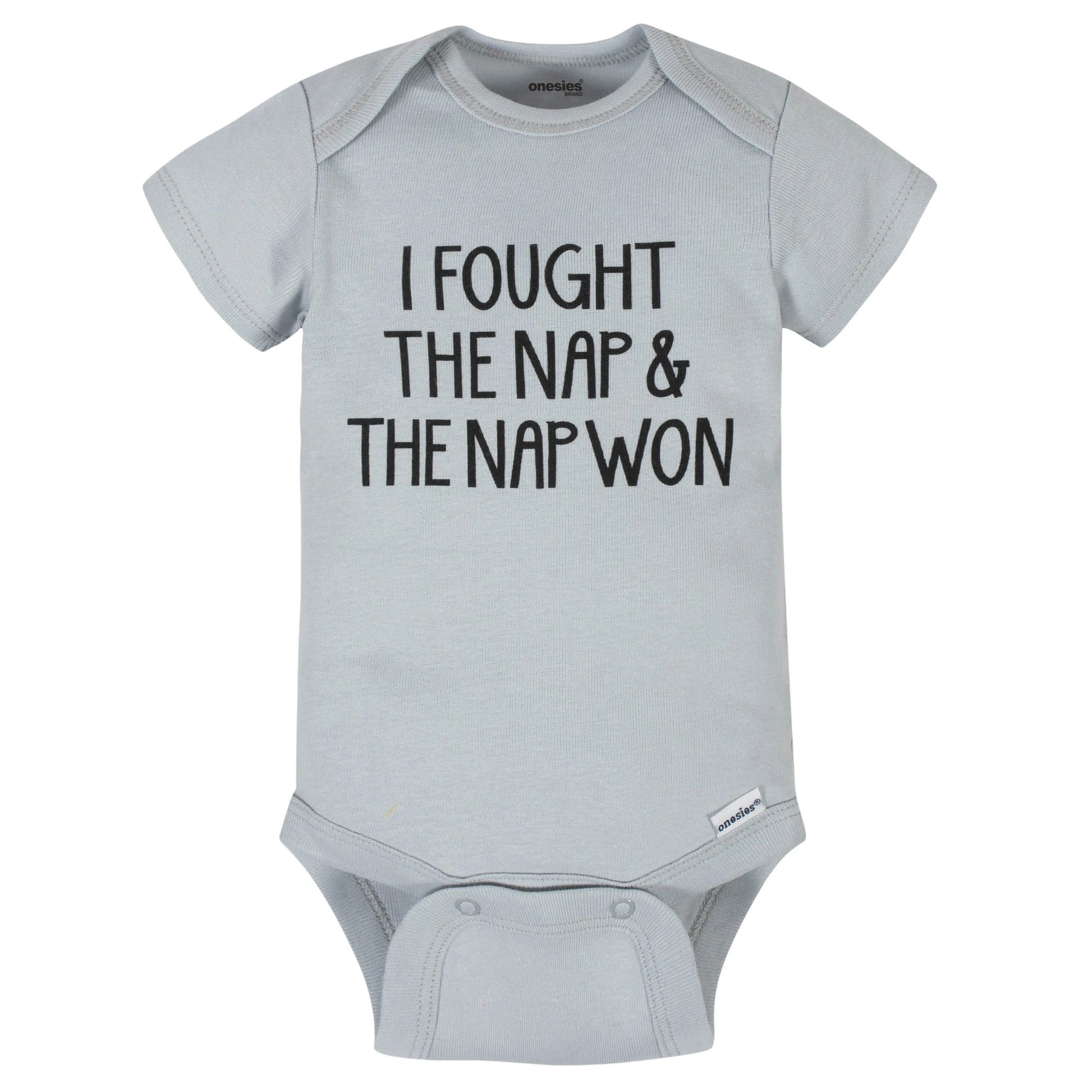 Ready to spice up baby’s wardrobe? These Onesies® Brand bodysuits are hilarious and adorable. Made with soft cotton rib, they’re super comfy as well. Each baby neutral Onesies® Brand bodysuit features an expandable lap shoulder neckline which keeps wardrobe changes easy peasy. The snaps are positioned higher so that diaper changes are too. Baby bodysuits are a necessity for the first year of baby’s life because they’re so versatile. Use them to layer when it’s cold or mix and match them with baby pants, baby socks, baby caps, baby jackets, and baby leggings! Plus, each funny baby Onesies® bodysuit is machine washable because, well, life. This pack contains eight bodysuits (that’s a baby outfit for every day of the week plus one bonus!).