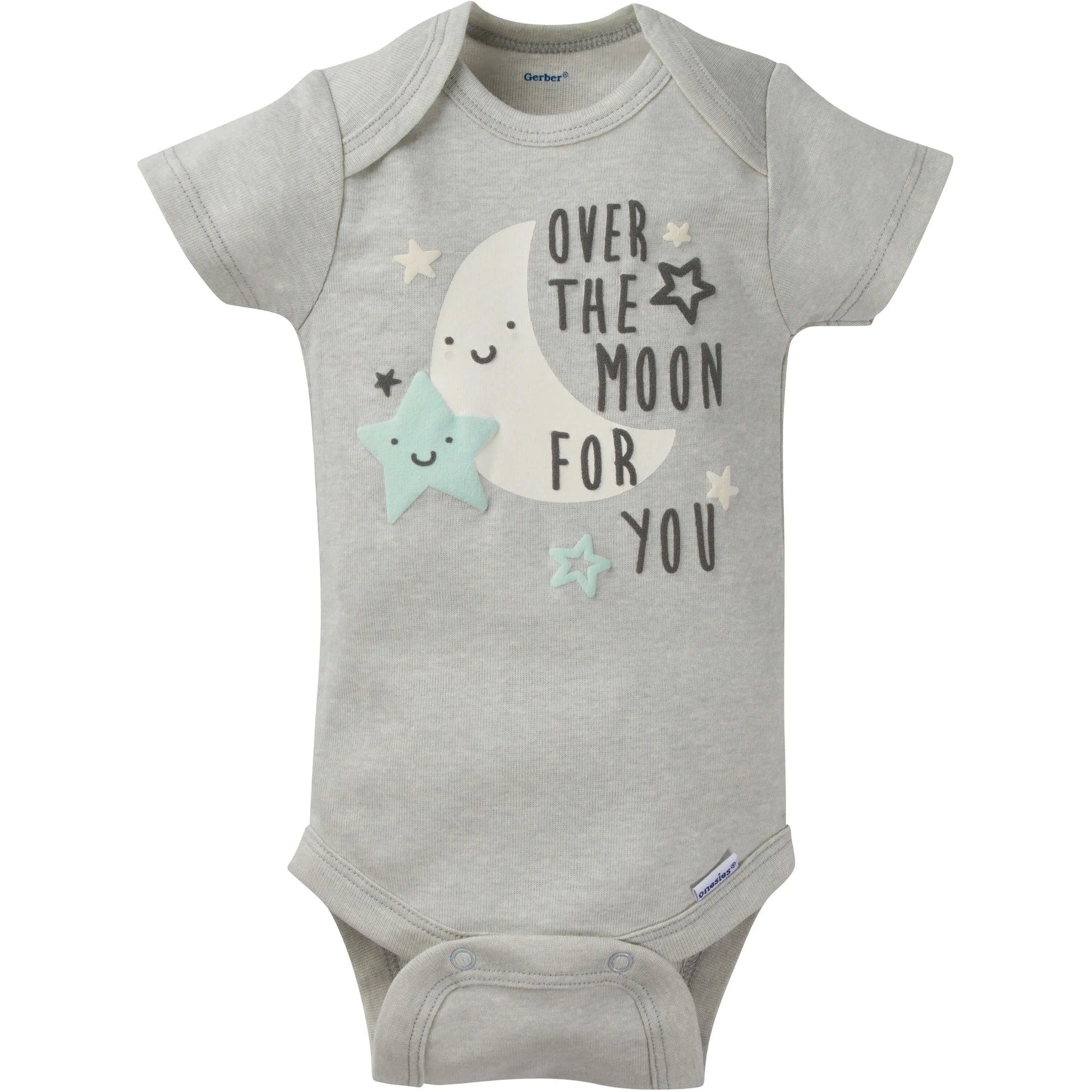 Give your little one the best with this 8-pack of baby boy or girl unisex short sleeve Onesies bodysuits from Gerber! The neutral screenprint and puff print designs combine to create fun outfits that little ones will love. Each bodysuit is unique, giving mom plenty of new possibilities for creating new outfits. They're made using a 100% cotton rib that breathes easily. The time-saving convenience of a higher-in-the-front bottom snap closure keeps time spent changing diapers to a minimum. Dressing is easier with the expandable lap shoulder neckline. Machine wash and dry fabric makes life simpler for busy moms.