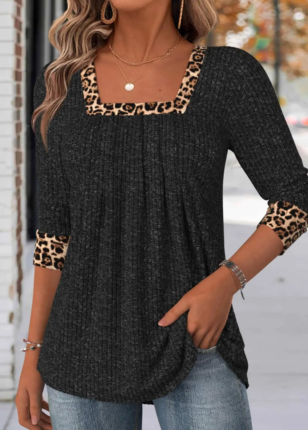 Black Leopard Long Sleeve Square Neck T Shirt