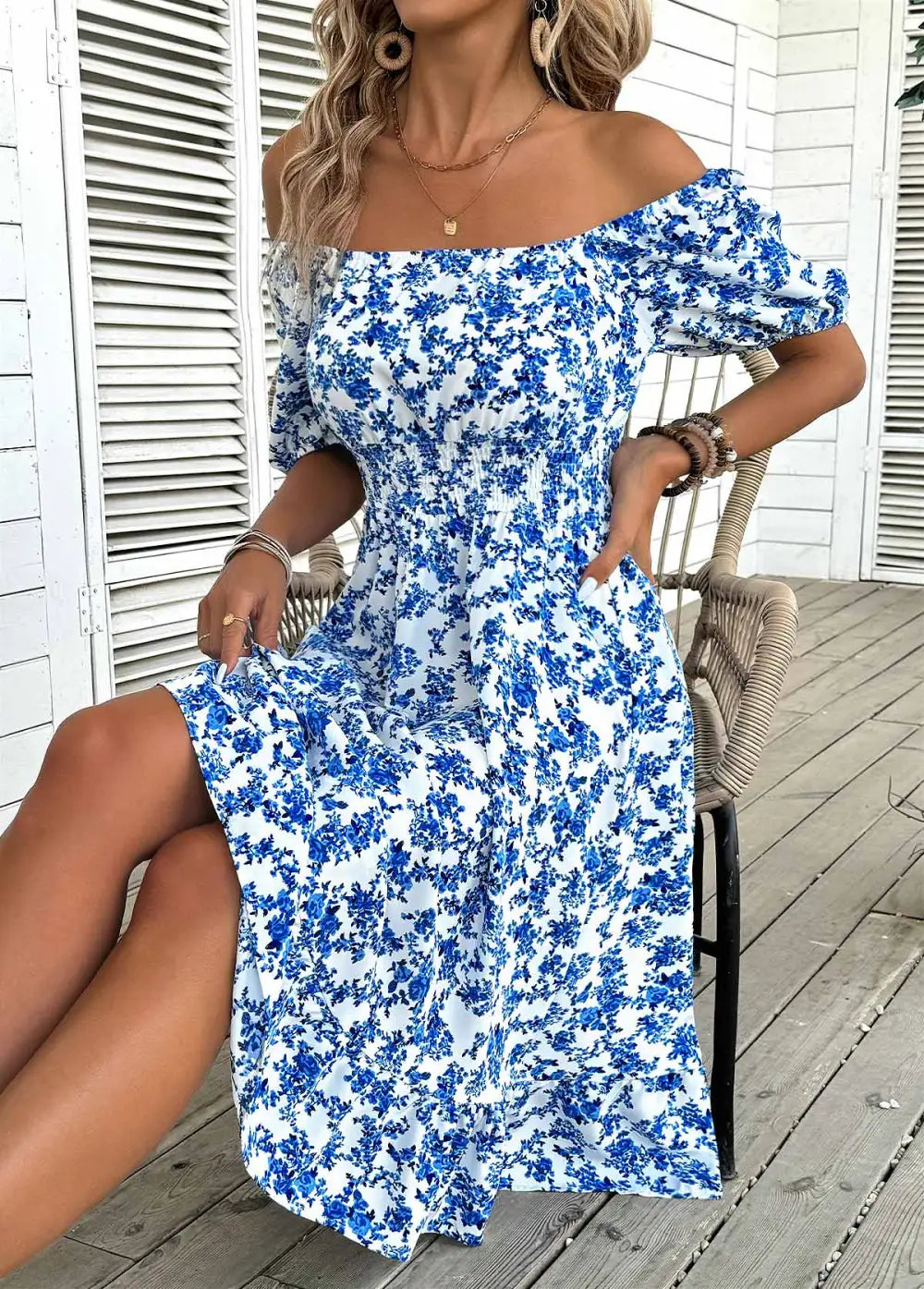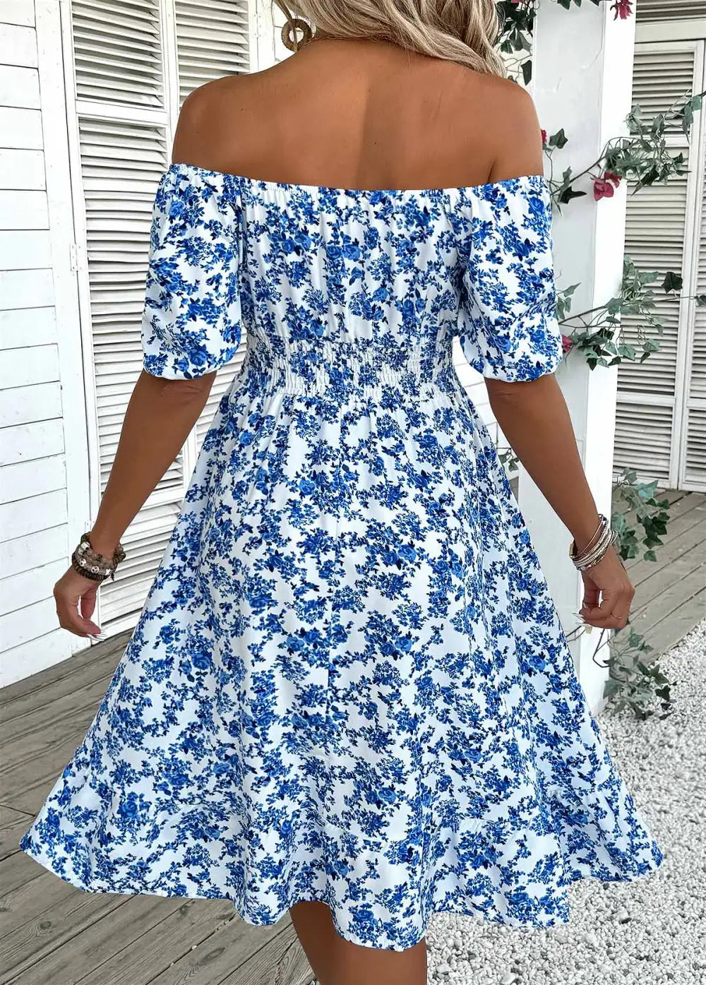 Blue Ditsy Floral Print Short Sleeve Off Shoulder Dress