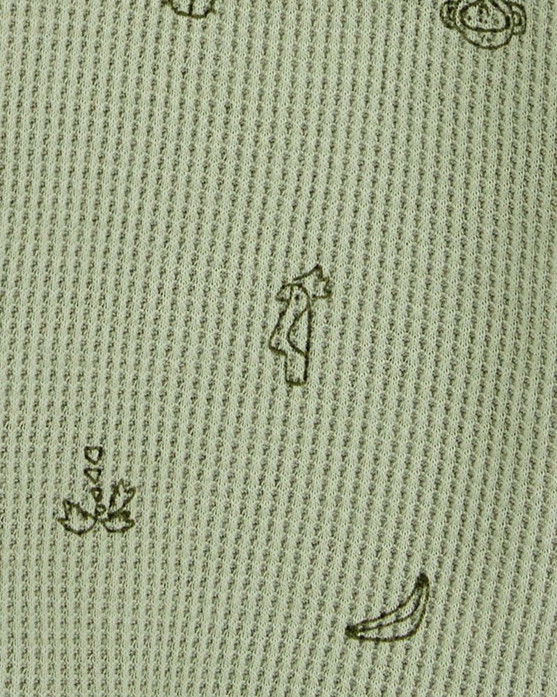 This romper features a cozy waffle knit and fun jungle print for your little one! Plus it has strong snaps at the legs for easy changes.