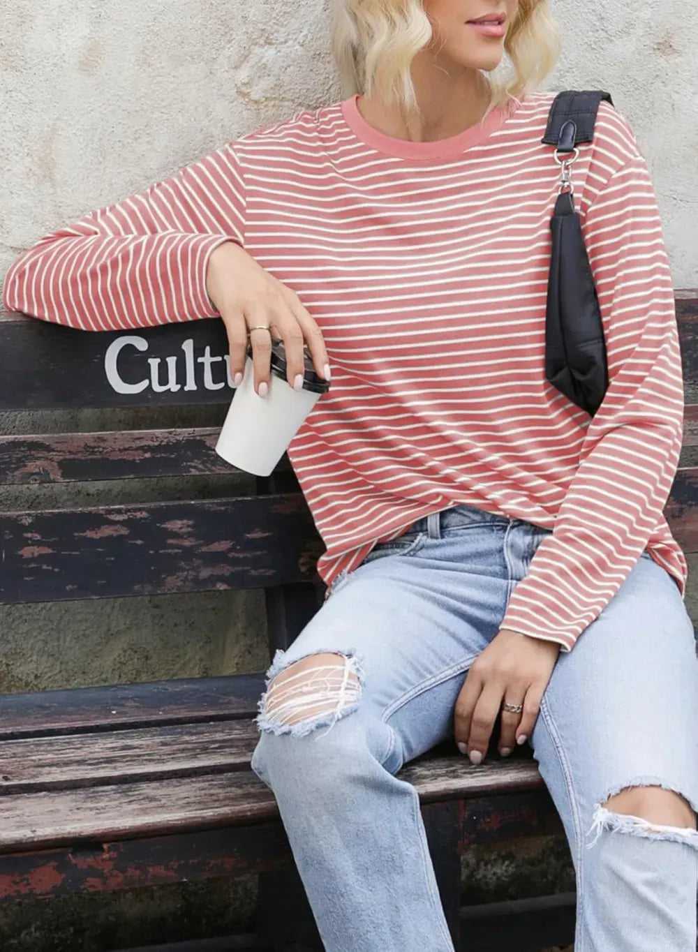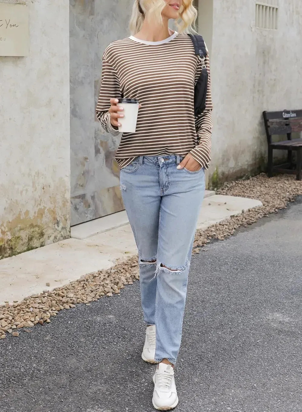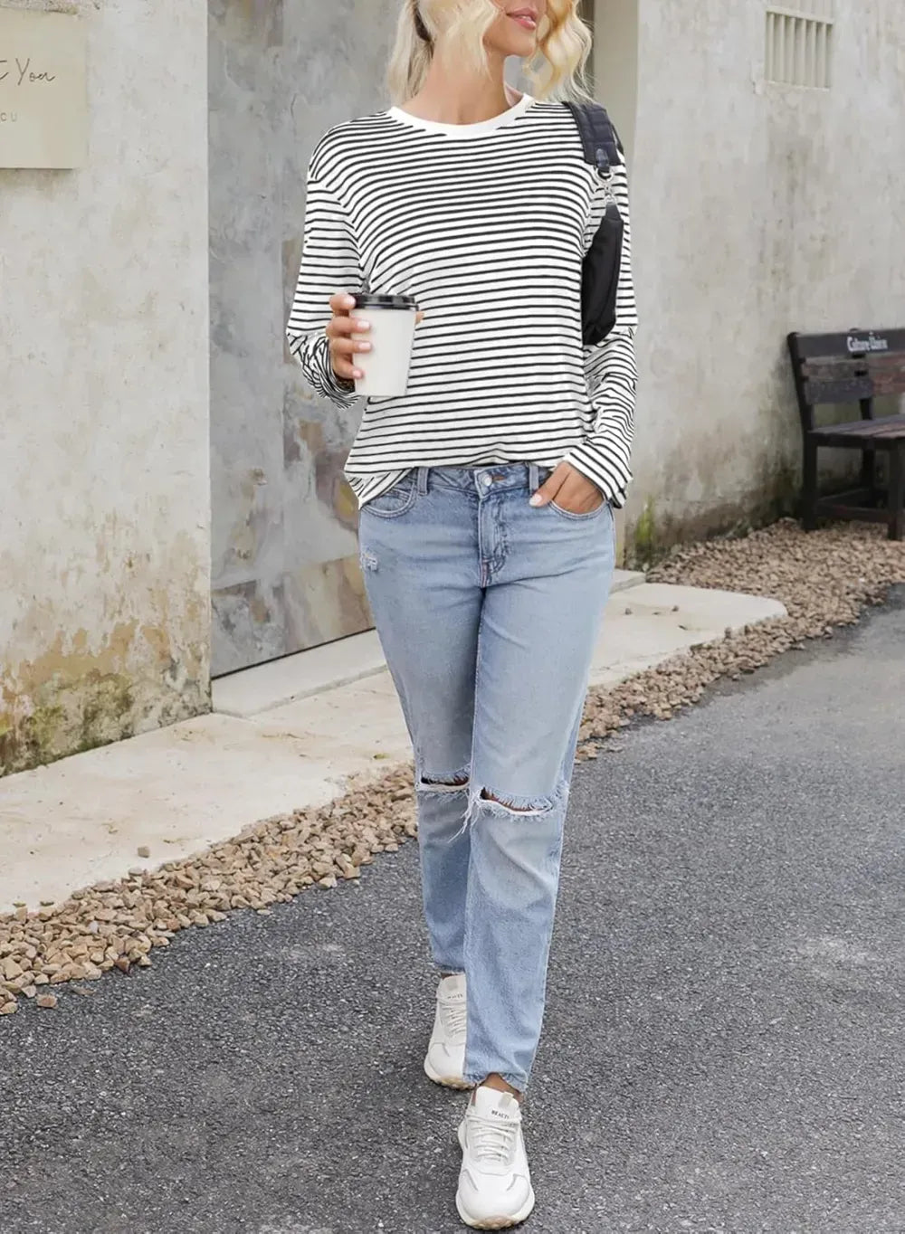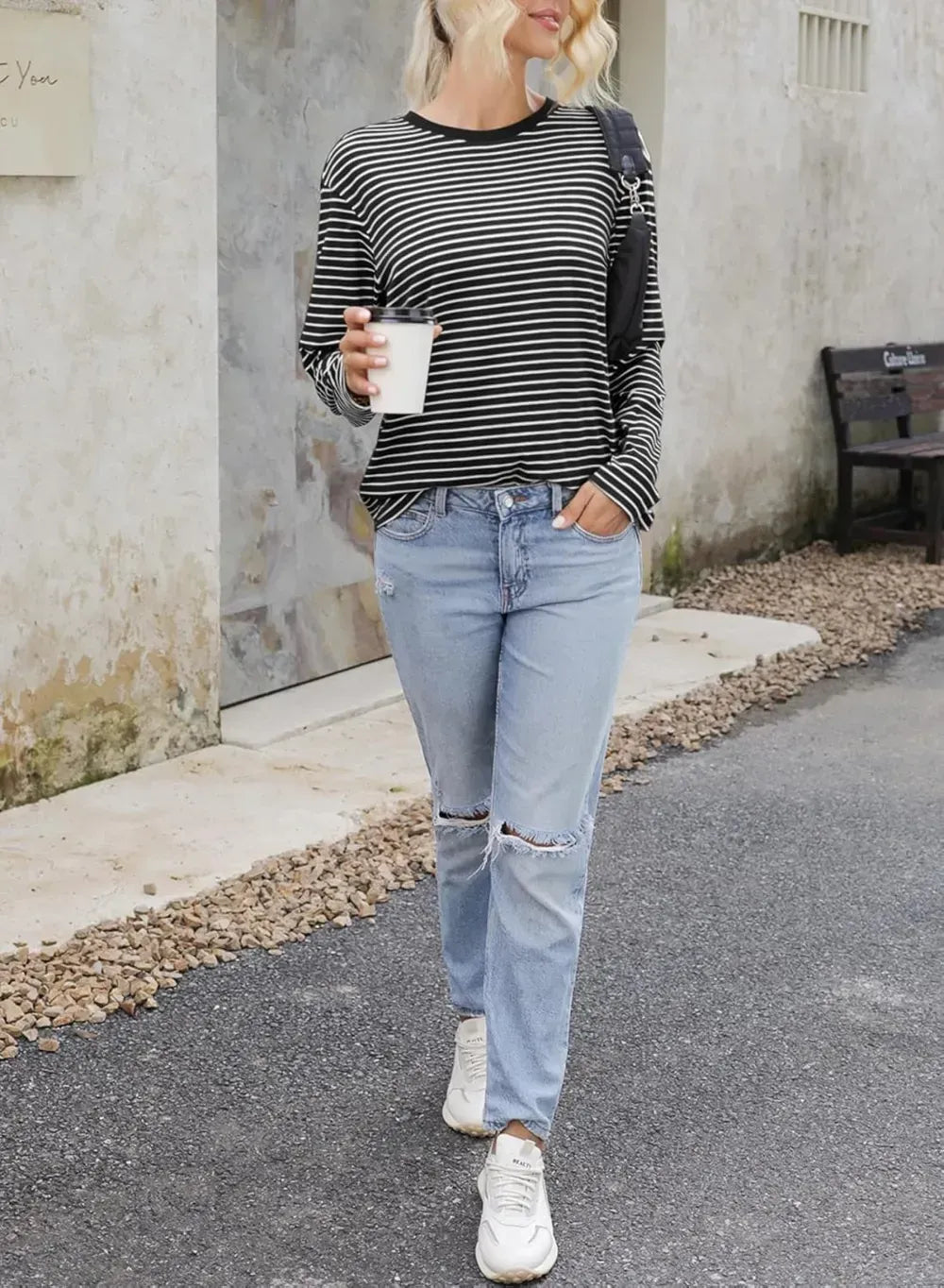 Dokotoo Women's Casual Striped Long Sleeve Tops Crew Neck Knit Ribbed Basic T Shirts