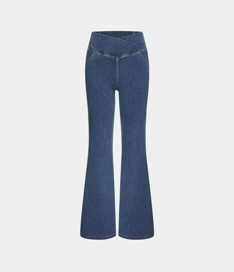 High Waisted Crossover Pocket Washed Stretchy Knit Denim Casual Super Flare Pants