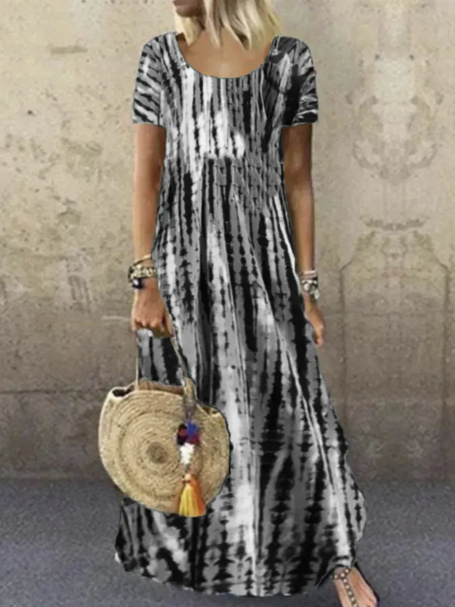 Ladies Round Neck Short Sleeve Tie-dye Printed Maxi Dress