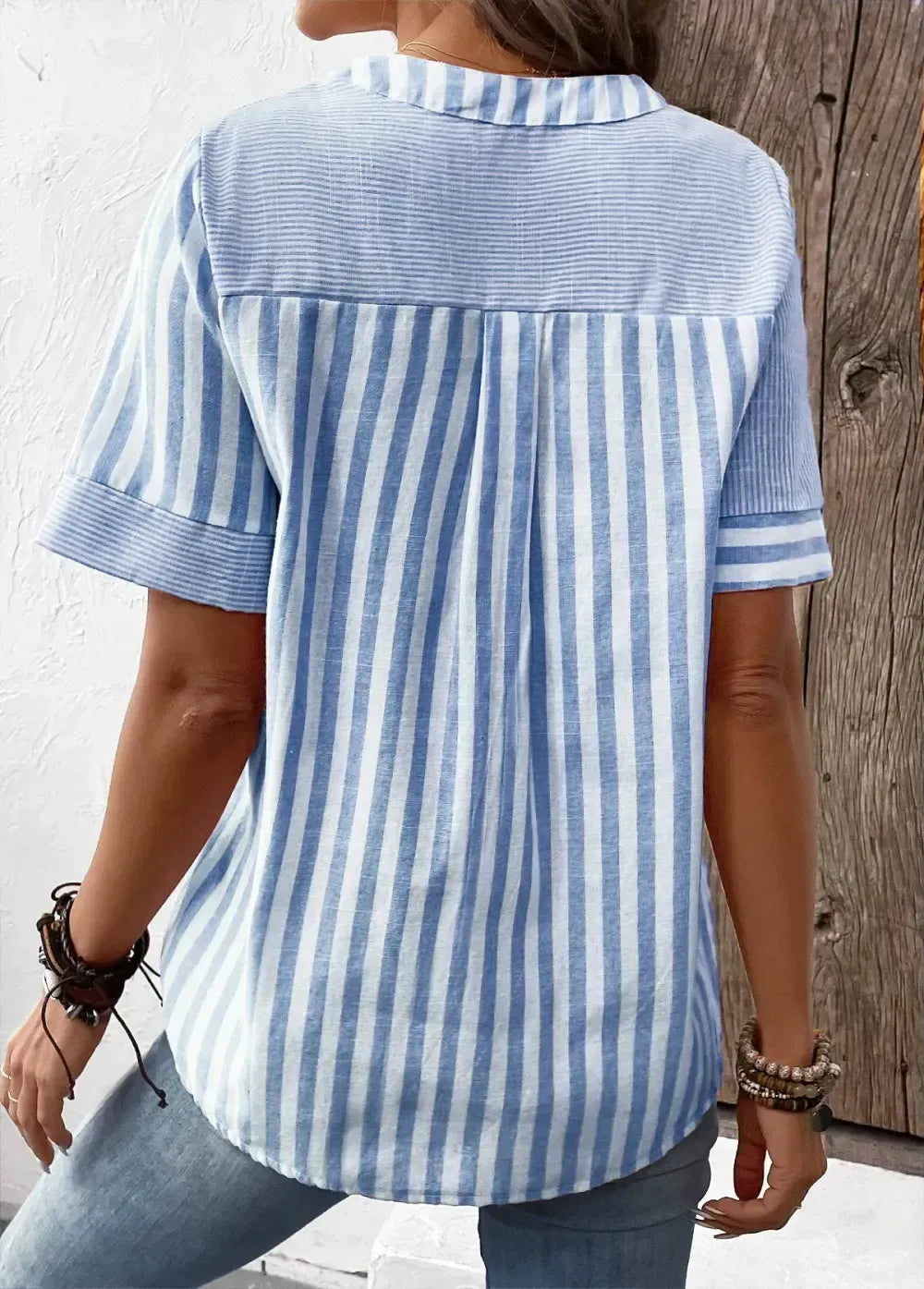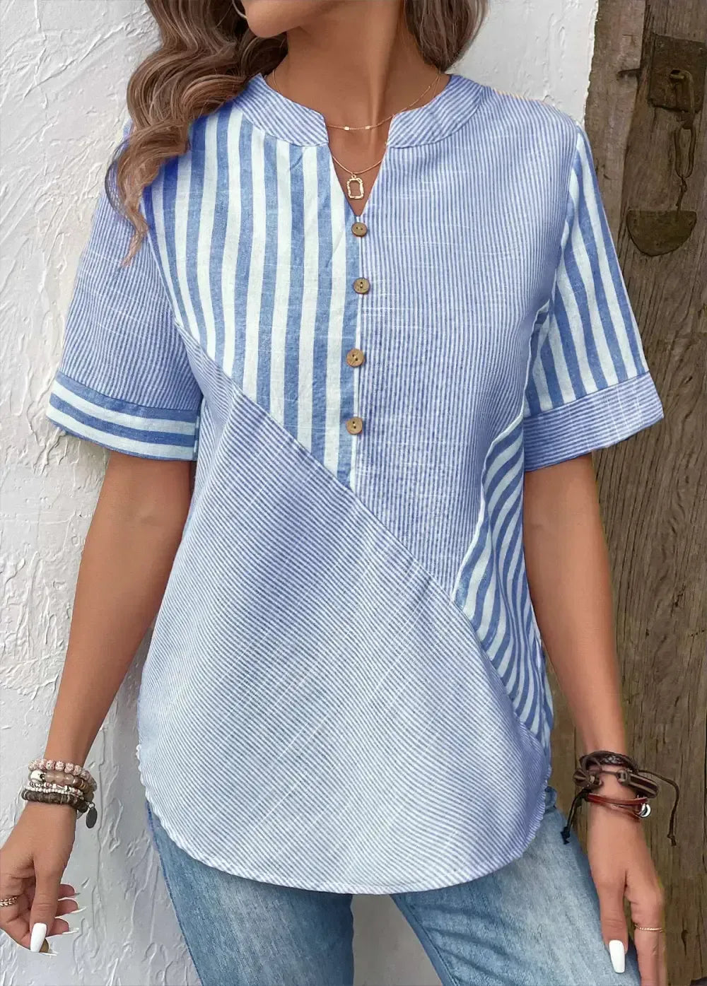 Light Blue Patchwork Striped Short Sleeve Split Neck Blouse