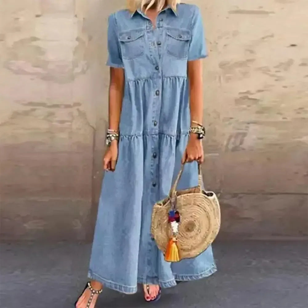 This button-front maxi dress is a must-have casual staple for your wardrobe, featuring a shift style, slightly oversized fit, and slightly cinched waist. Two top pockets, a fold-over collar, and a tiered pleated skirt make it suitable for a beach day, a casual lunch, out to dinner, or for your next vacation. Machine wash normal with light colors or hand wash. May be hung up to dry or lay flat. Light ironing if needed.