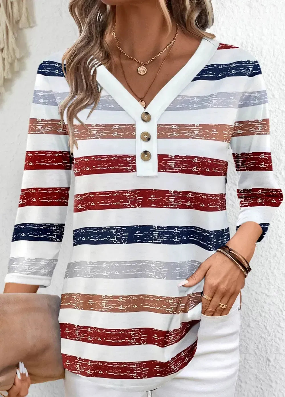 Multi Color Button 3/4 Sleeve V Neck T Shirt