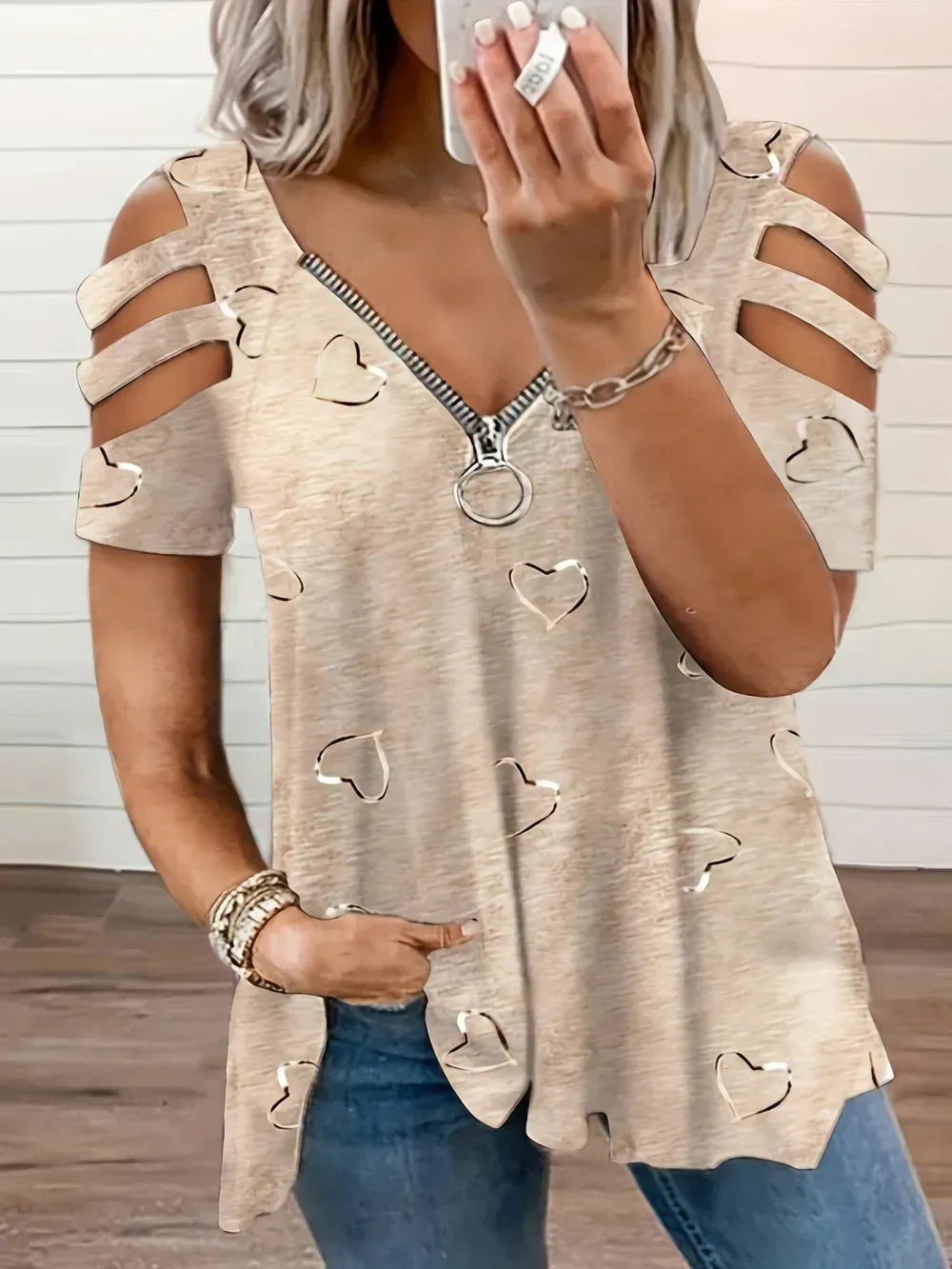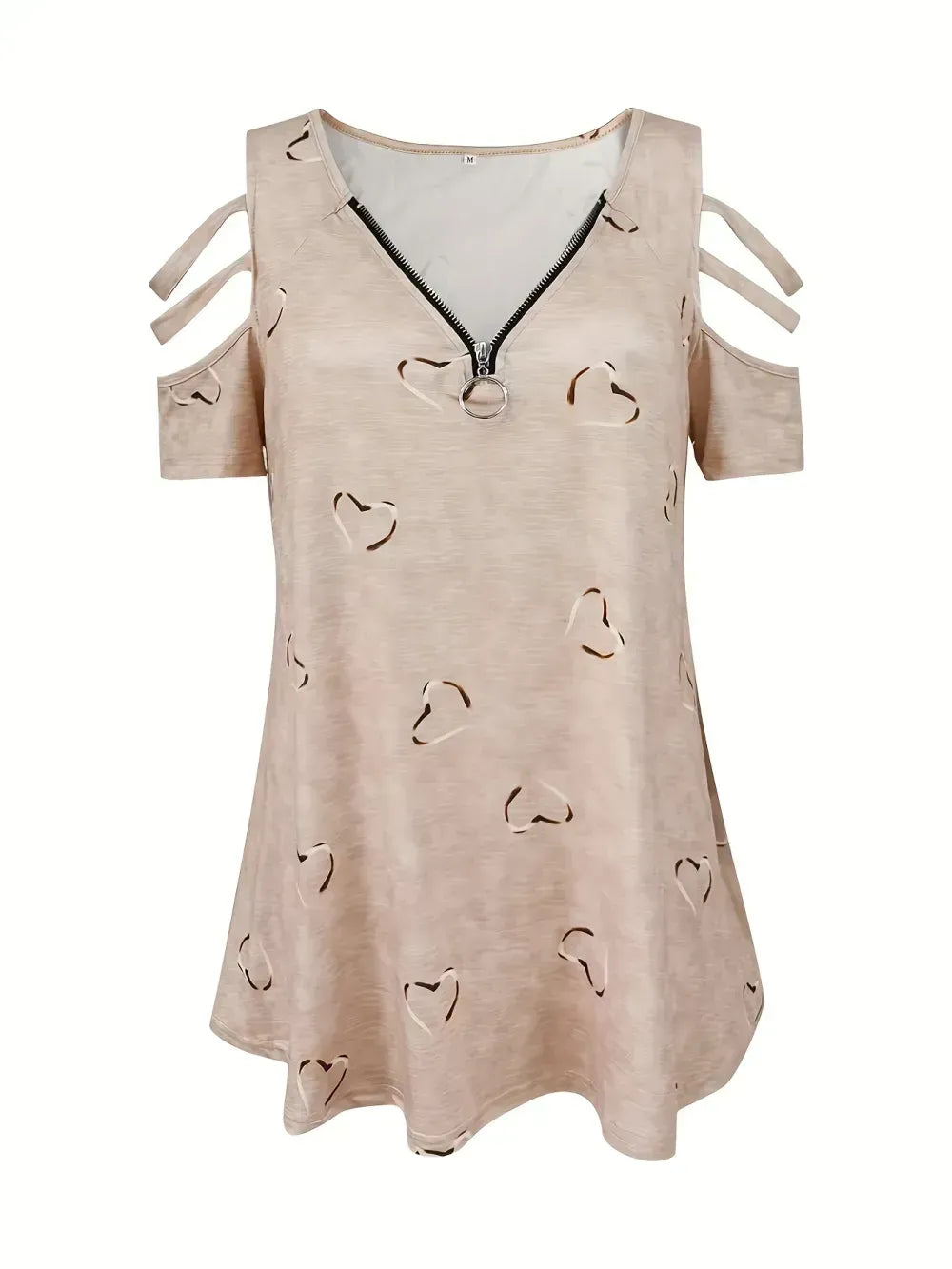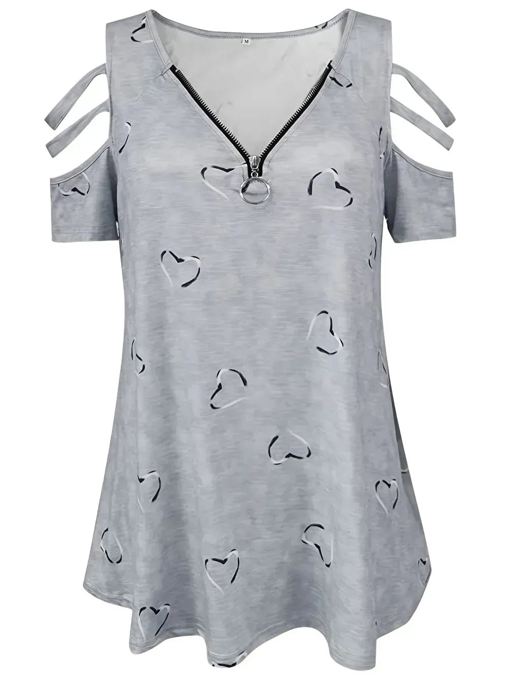 Plus Size Heart Print Zipper Short Sleeve Top, Women's Plus Slight Stretch V Neck Casual T-shirt