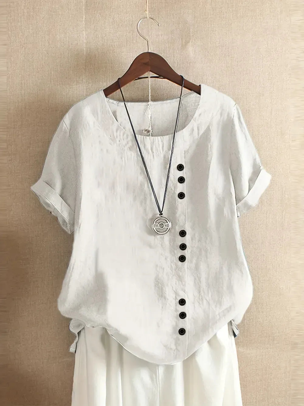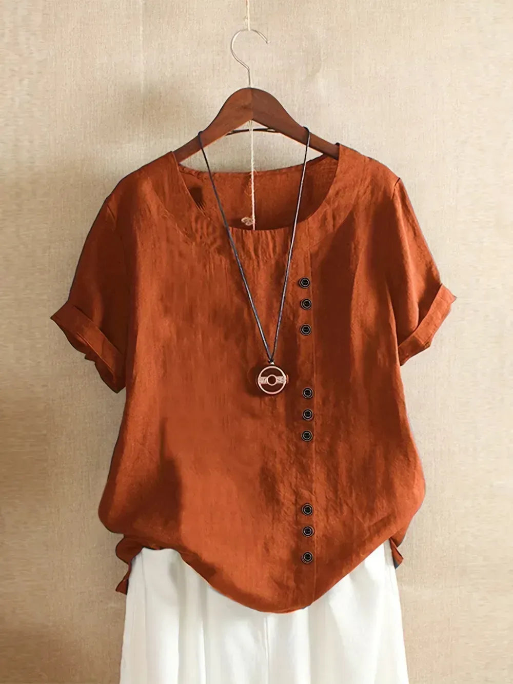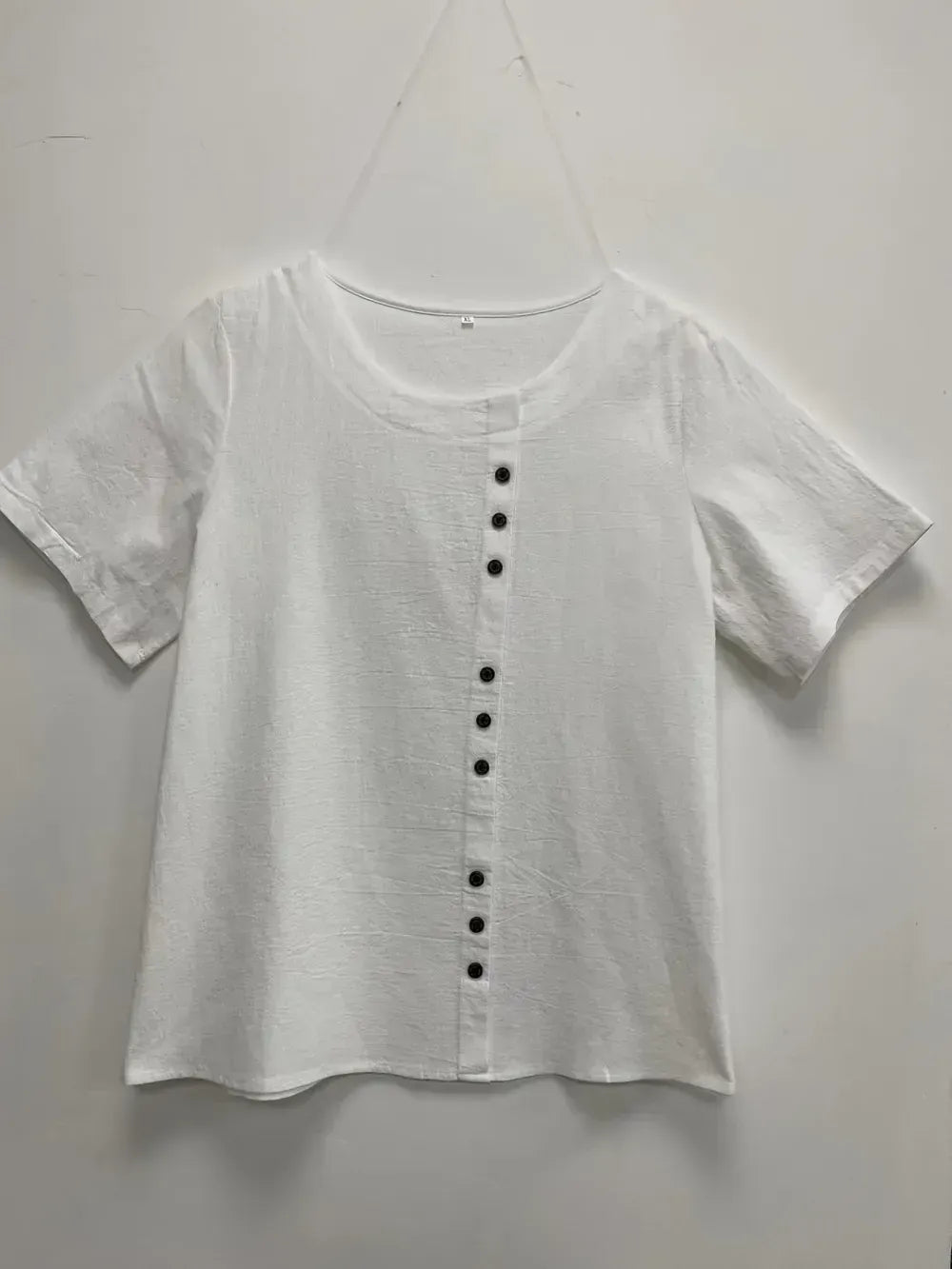 Plus Size Solid Button Decor Short Sleeve T-shirt, Women's Plus Casual Round Neck Tee