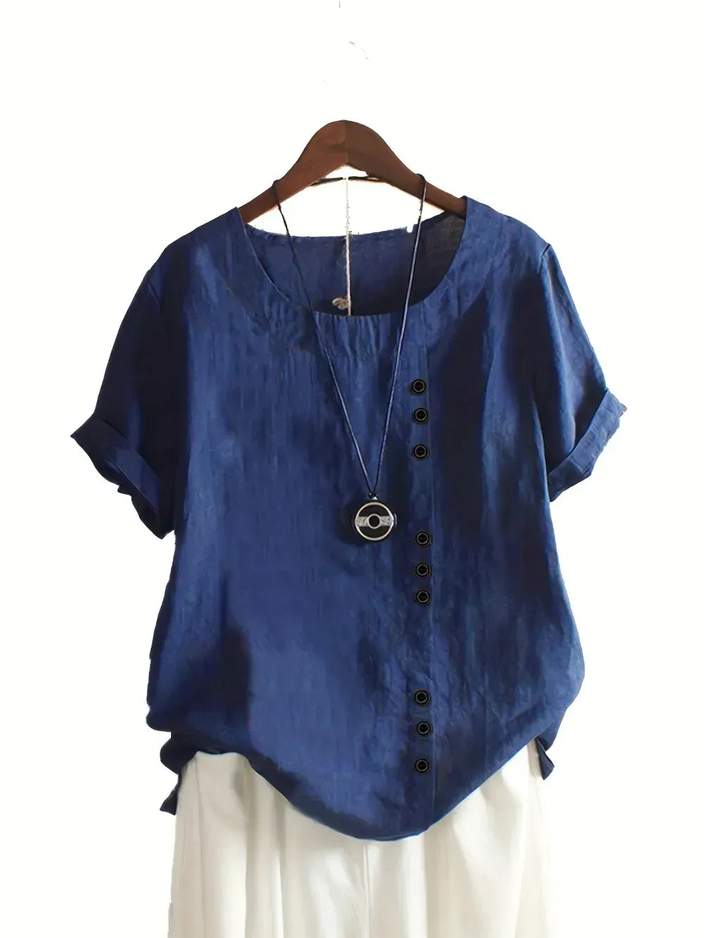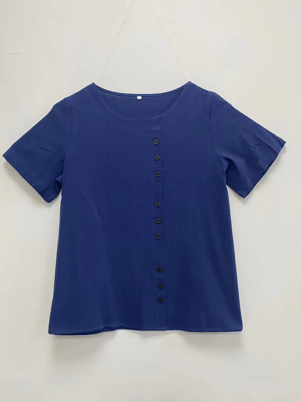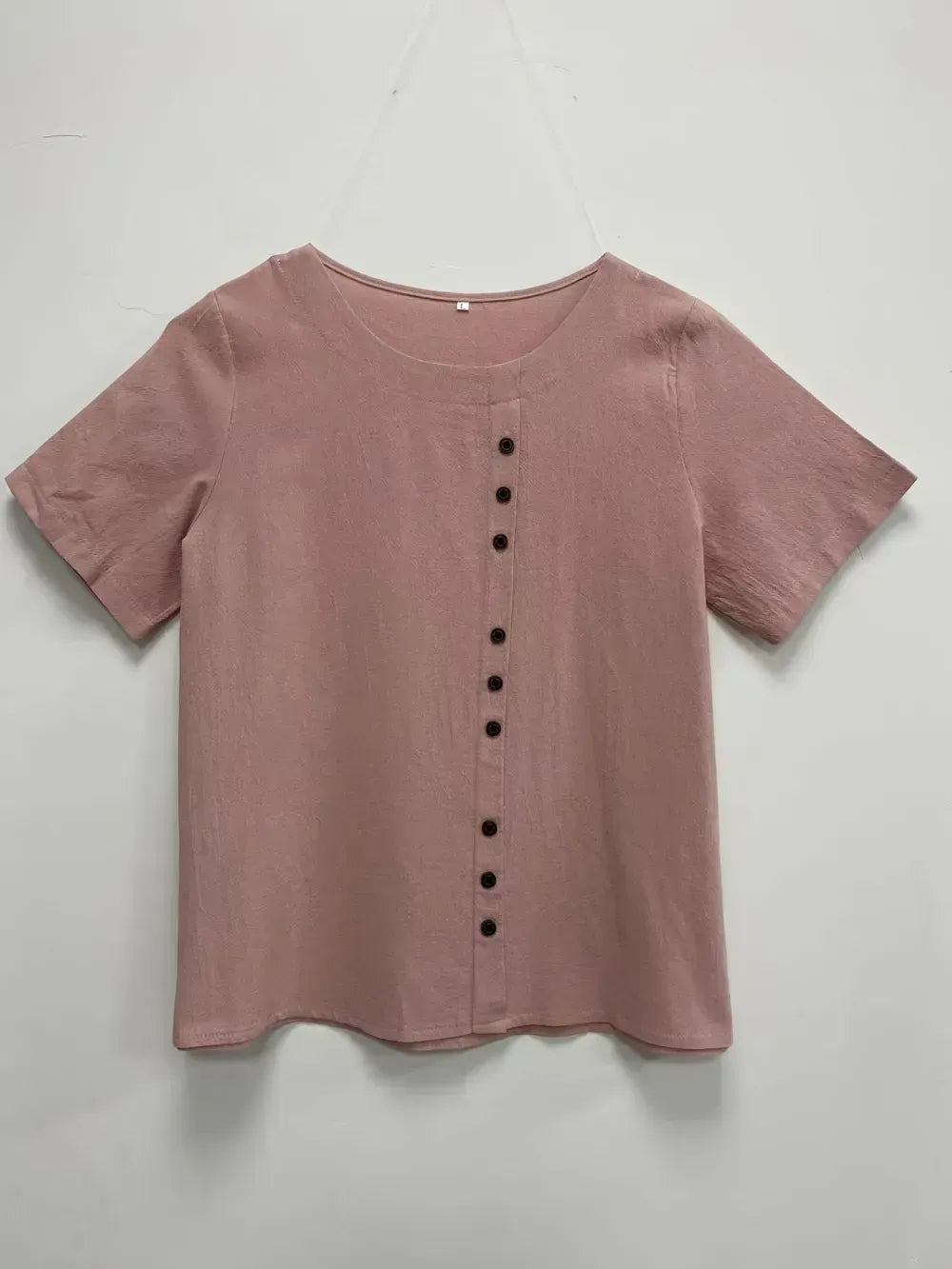 Plus Size Solid Button Decor Short Sleeve T-shirt, Women's Plus Casual Round Neck Tee