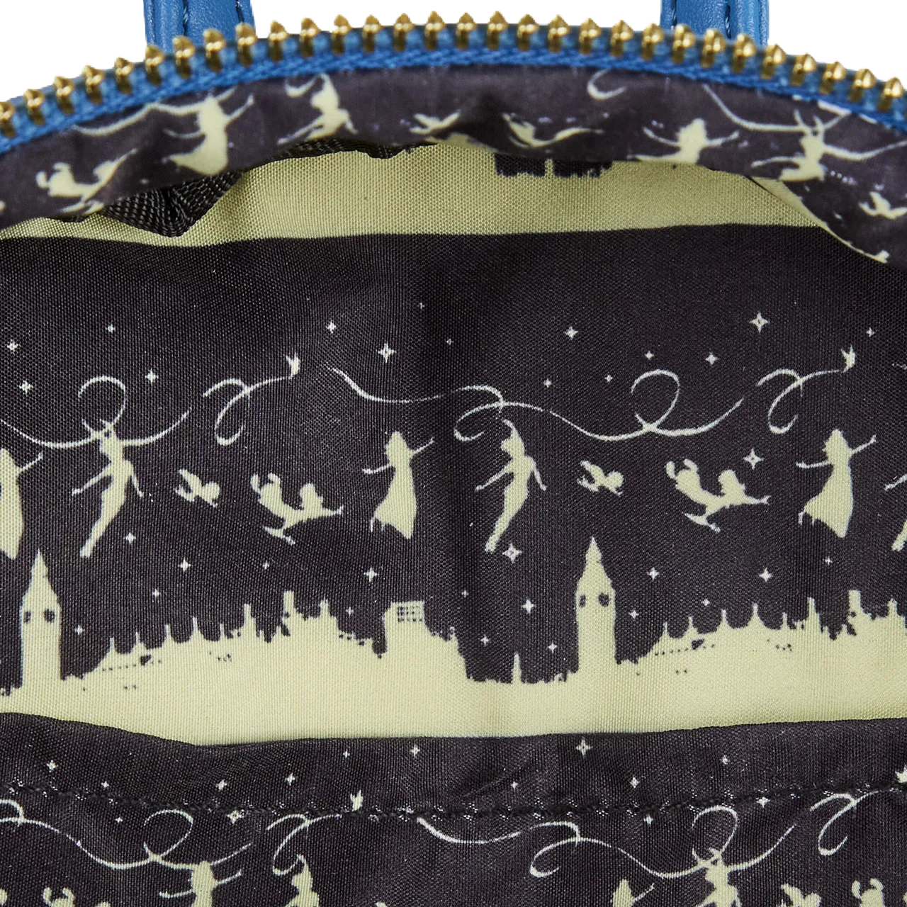 Introducing the Peter Pan Glow Clock Mini Backpack from Loungefly. This faux leather mini backpack features enameled zipper charm, printed, applique, and debossed details, as well as adjustable straps.