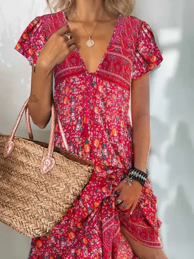 V Neck Casual Floral Printed Short Sleeve Woven Dress