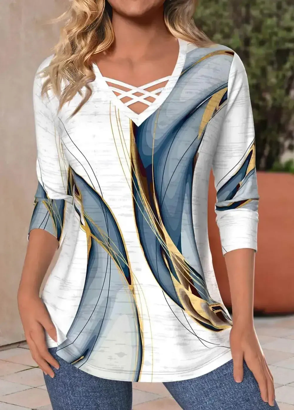 White Criss Cross Geometric Print Long Sleeve T Shirt