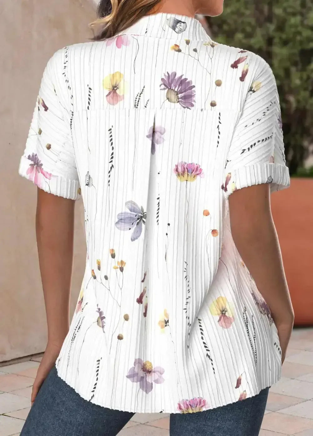 White Textured Fabric Floral Print Short Sleeve Blouse