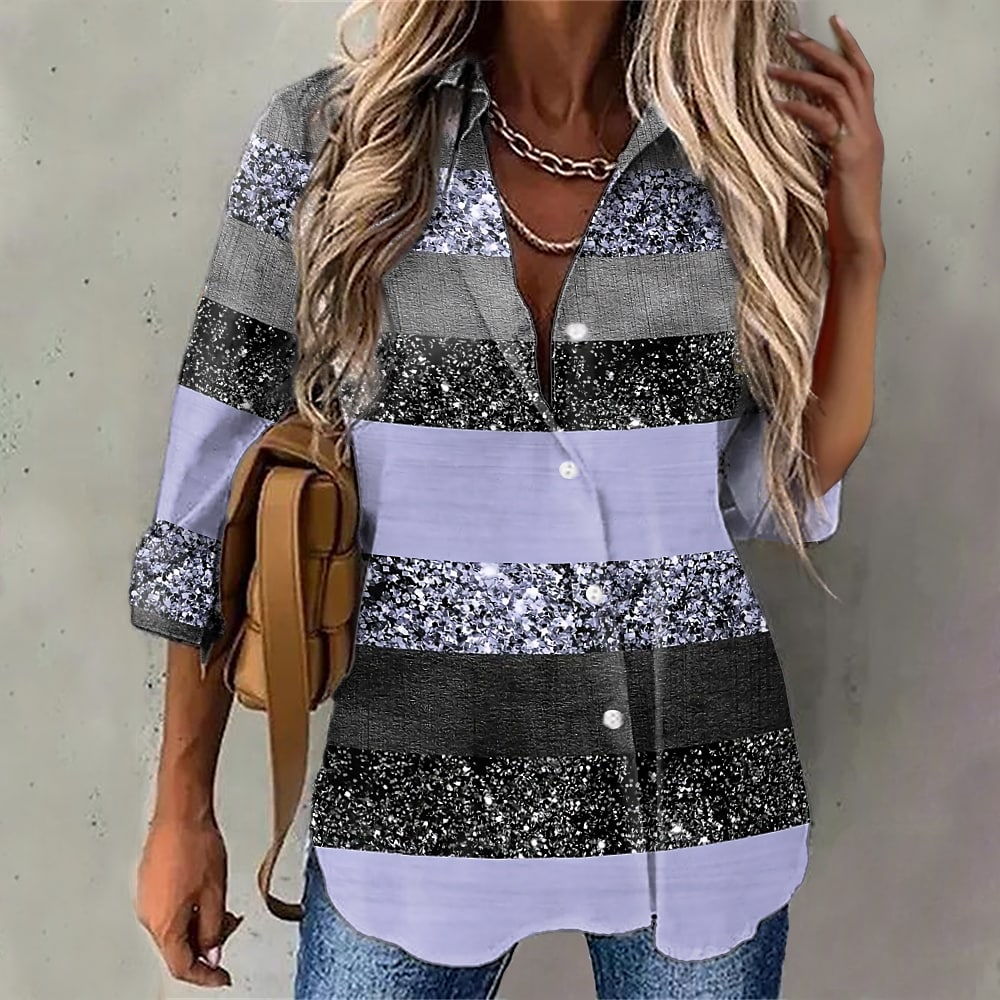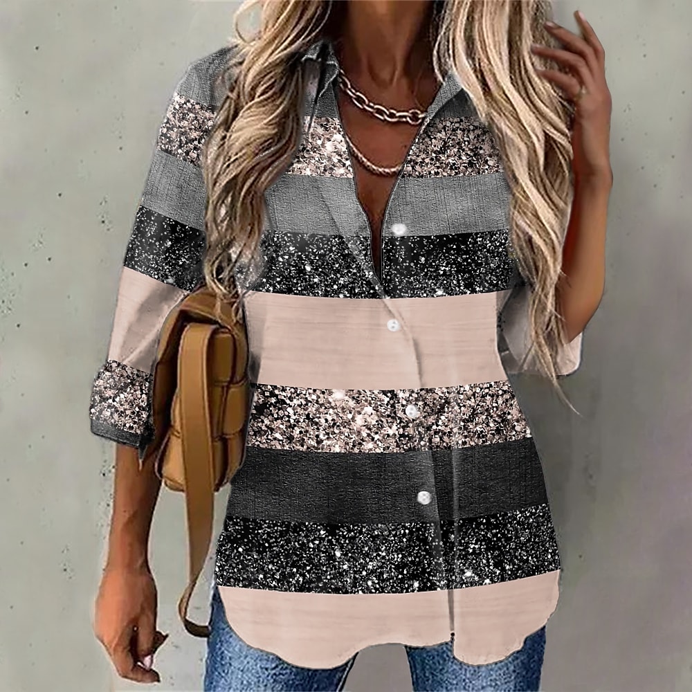 Gender:Women's,Style:Streetwear,Casual,Occasion:Weekend,Daily,Tops Type:Shirt,Blouse,Neckline:Shirt Collar,Fabric:Polyester,Design:Print,Button,Details:Without Lining,Sleeve Length:Long Sleeve,Elasticity:Inelastic,Top Length:Regular,Pattern:Glittery,Sparkly,Striped,Graphic,