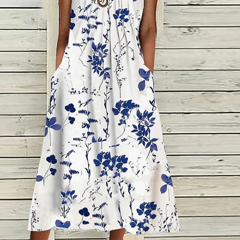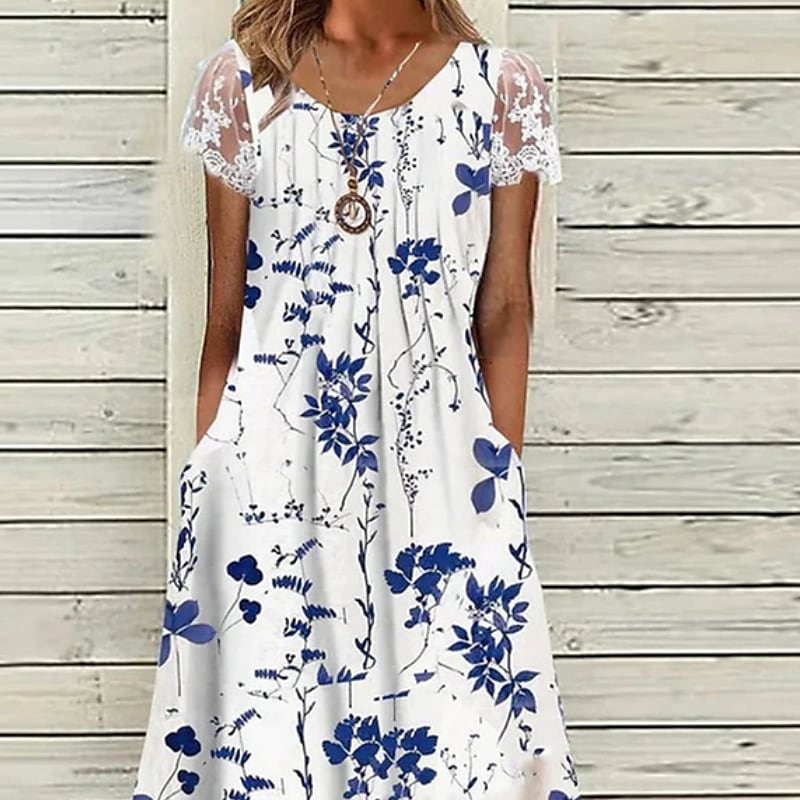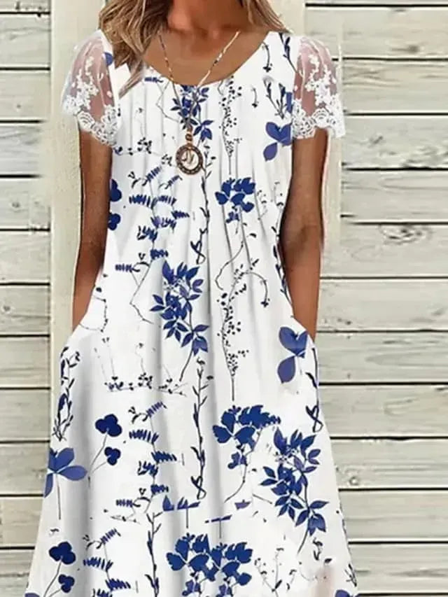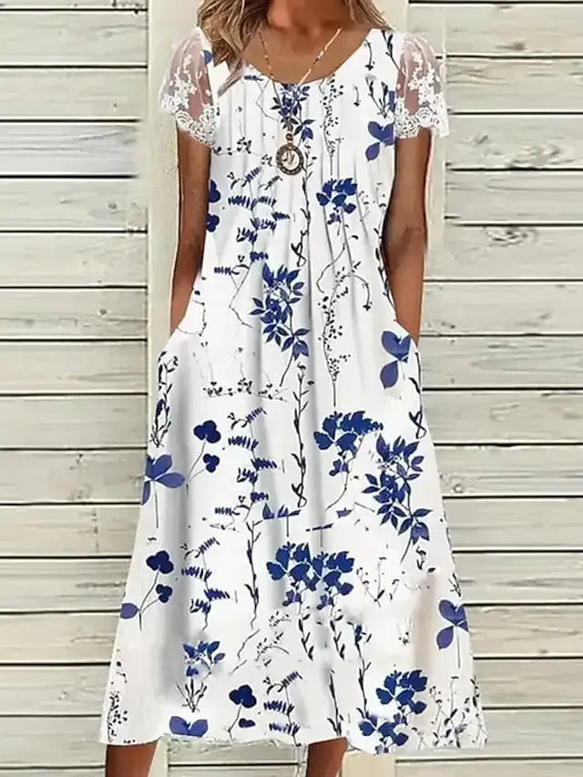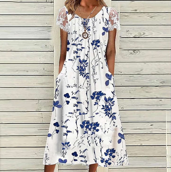 Gender:Women's,Style:Modern,Casual,Classic,Occasion:Weekend,Daily,Vacation,Dresses Type:Casual Dress,Neckline:Crew Neck,Fabric:Polyester,Design:Print,Ruched,Sleeve Length:Short Sleeve,Sleeve Type:Lace Sleeve,Elasticity:Micro-elastic,Look After Me:Machine wash,Pattern:Print,Floral,Season:Summer,Spring,Dress Length Type:Midi Dress,Fit Type:Regular Fit,2023 Trends:2023,