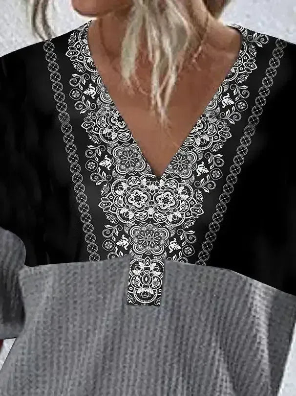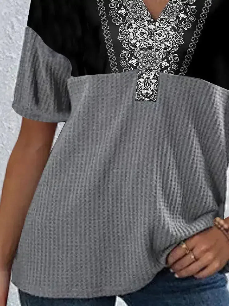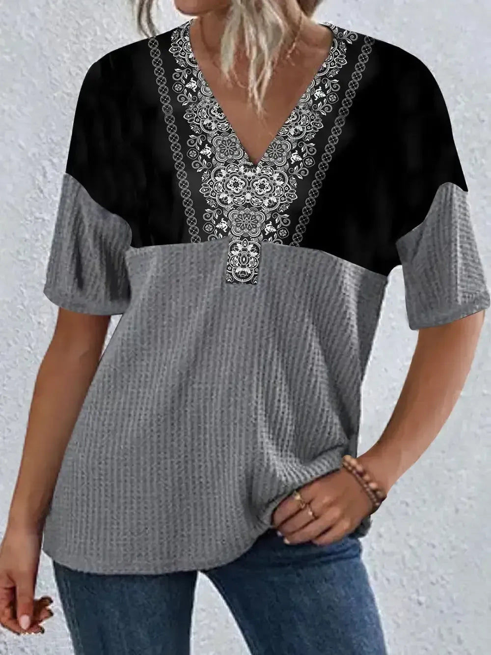 Women's Stitching Colorblock Printed Short Sleeve V-neck Top