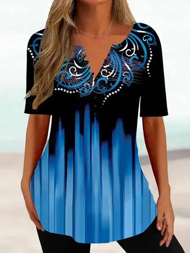 Gender:Women's,Style:Basic,Occasion:Casual,Tops Type:T shirt Tee,Neckline:V Neck,Fabric:Polyester,Design:Print,Button,Sleeve Length:Short Sleeve,Elasticity:Micro-elastic,Look After Me:Machine wash,Wet and Dry Cleaning,Washable,Pattern:Floral,Graphic,Theme:Floral,