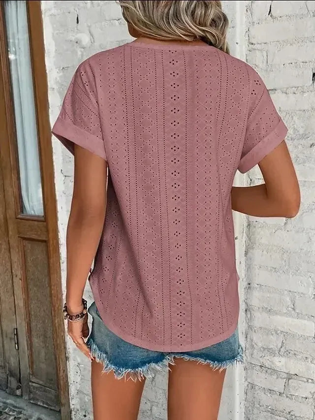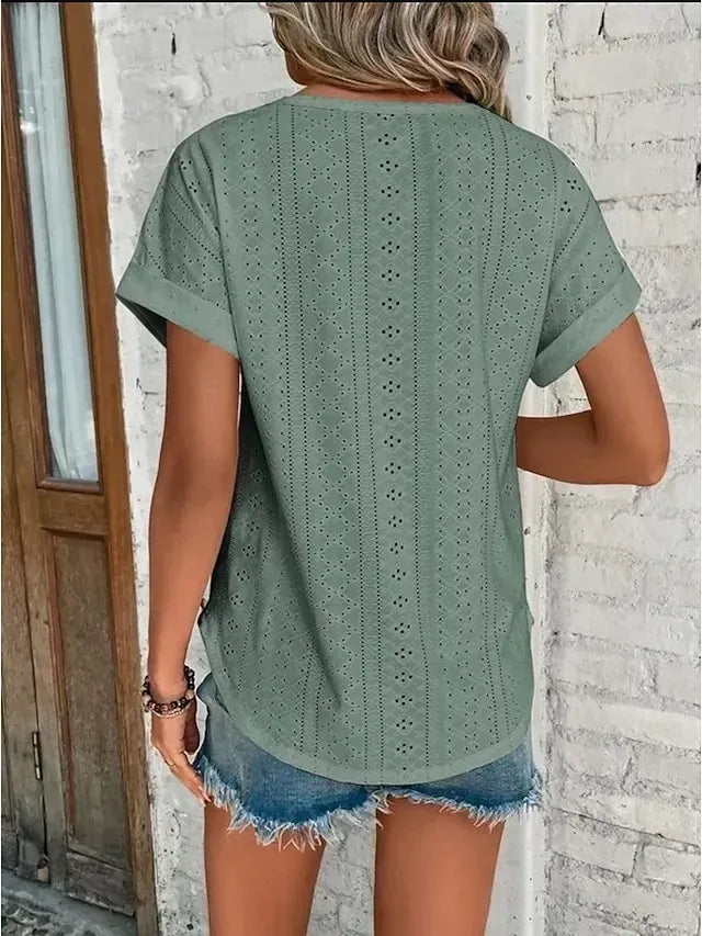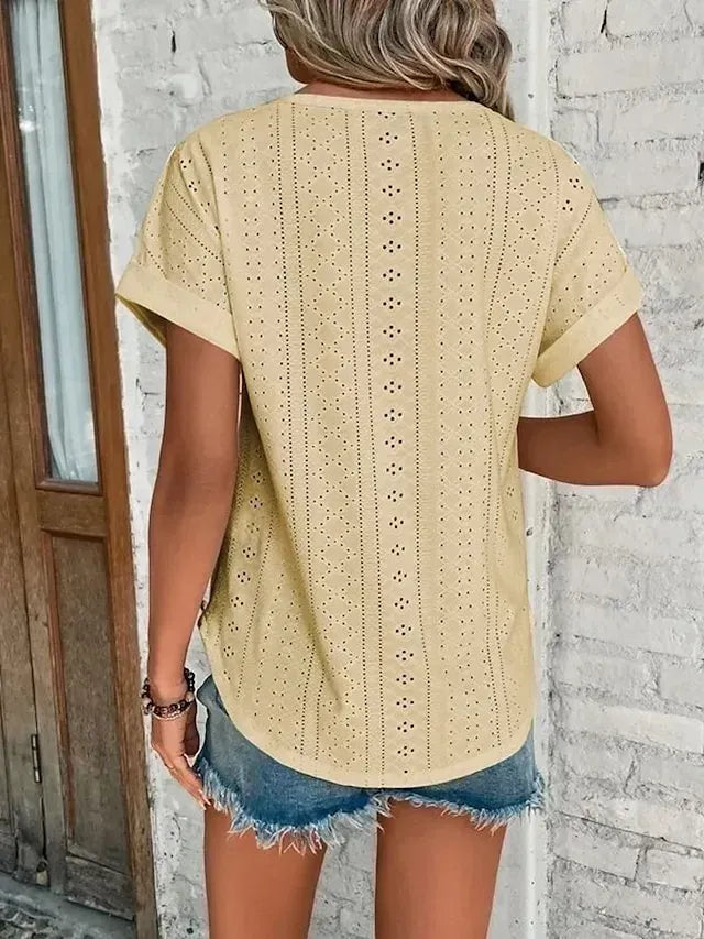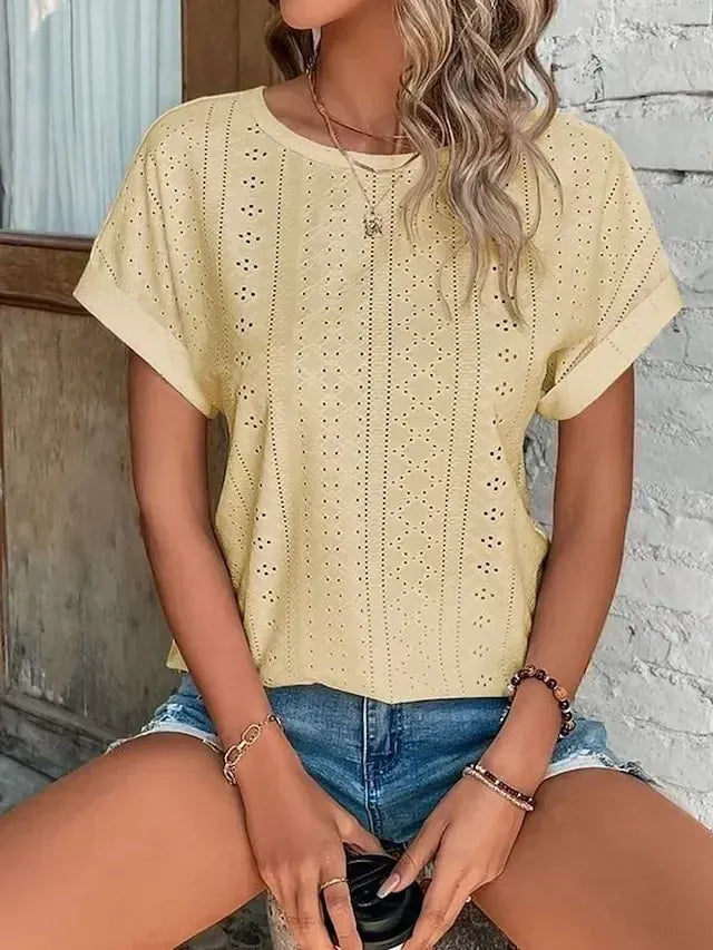 Gender:Women's,Style:Basic,Occasion:Weekend,Daily,Tops Type:White Eyelet Tops,T shirt Tee,Neckline:Round Neck,Fabric:Cotton,Design:Cut Out,Sleeve Length:Short Sleeve,Elasticity:Micro-elastic,Look After Me:Machine wash,Wet and Dry Cleaning,Washable,Pattern:Plain,